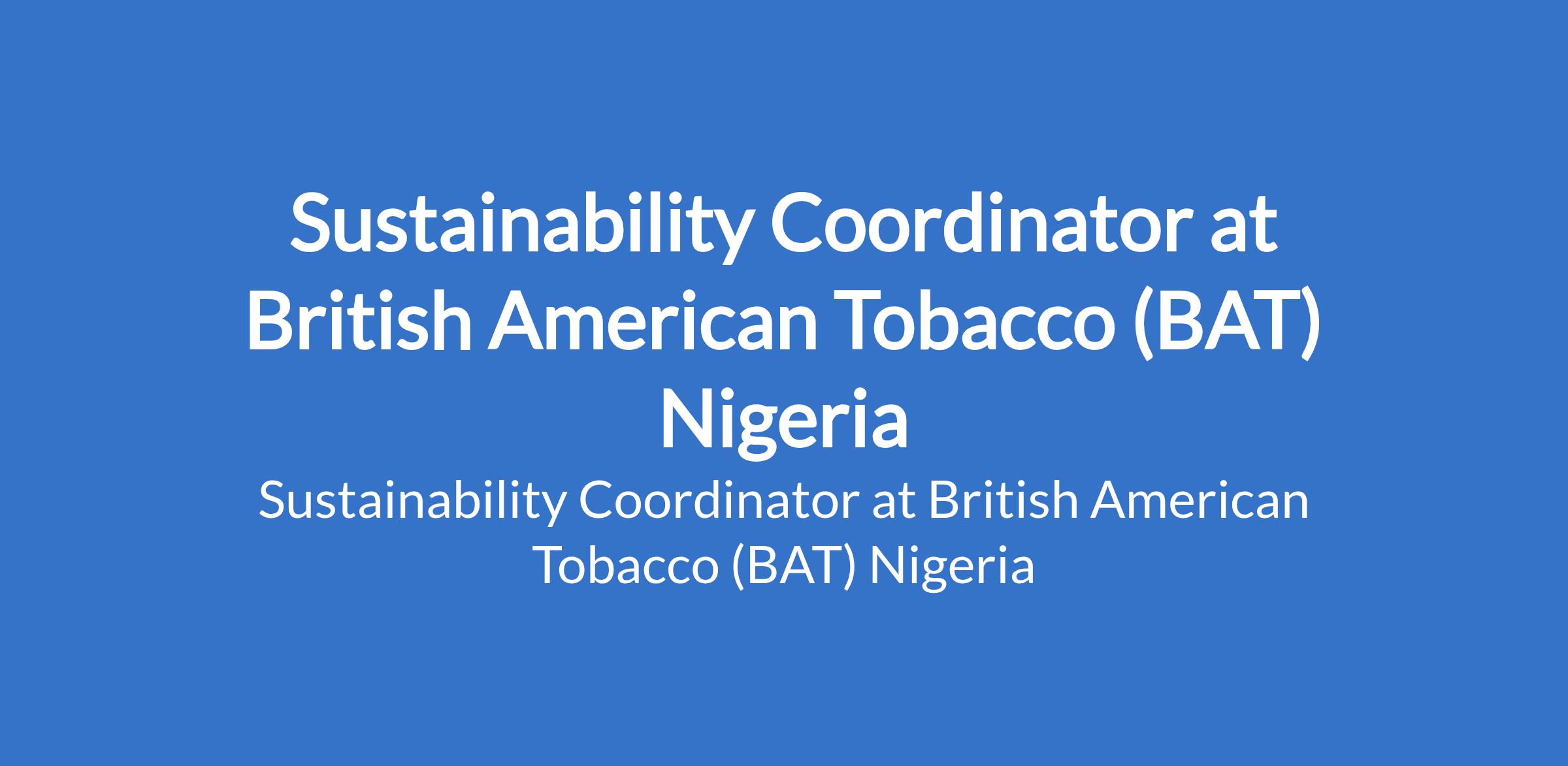 British American Tobacco (BAT) Nigeria is recruiting to fill the position of: Sustainability Coordinator. The position is located in Ibadan, Oyo State. Interested candidates should possess a Bachelors Degree in Engineering / Science or relevant field with a minimum of five years experience in Environmental Health and Safety role.