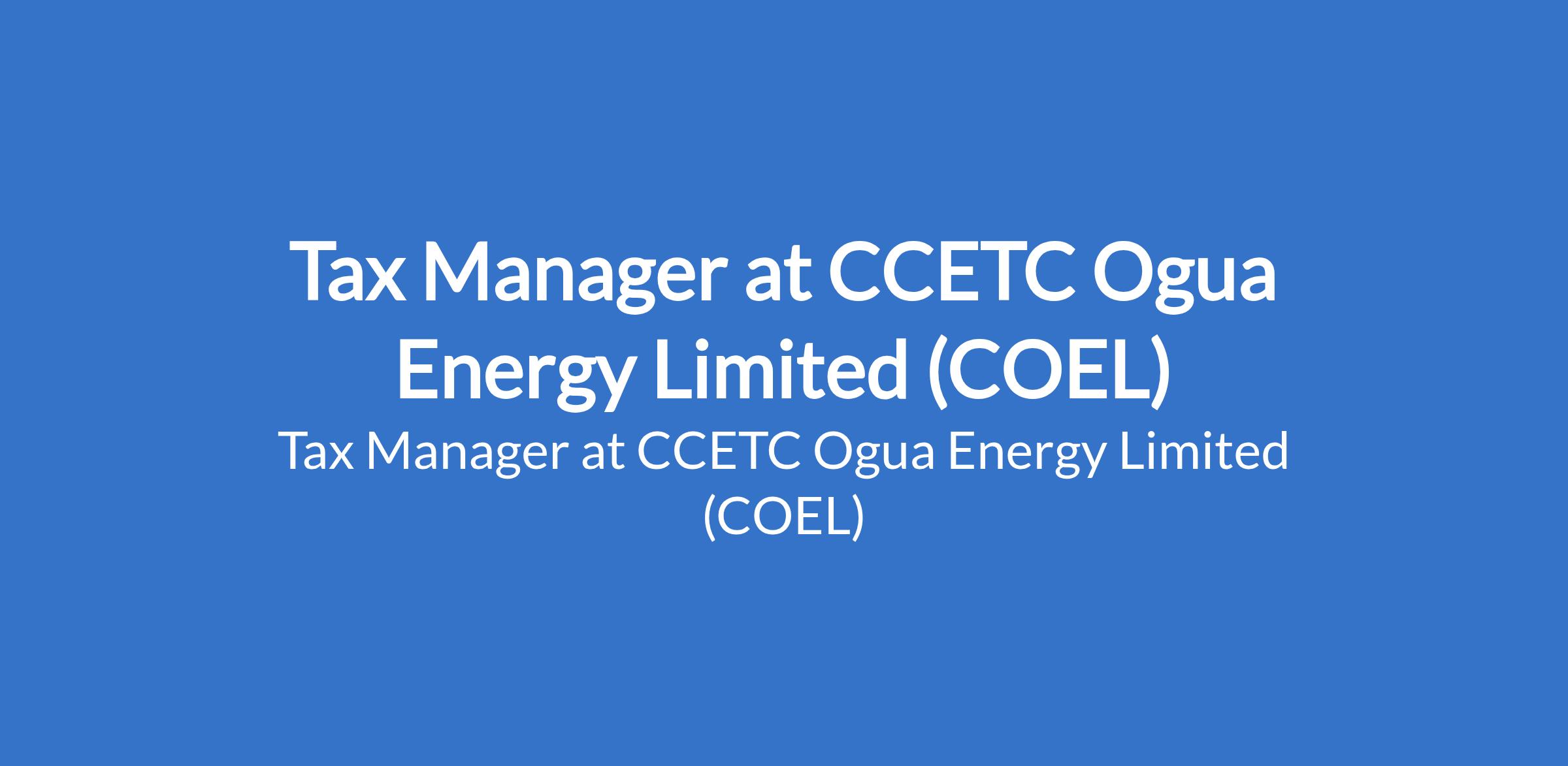CCETC Ogua Energy Limited (COEL) is recruiting to fill the position of: Tax Manager. The position is located in Lagos-Ibadan Expressway - Lagos, & Ogun States. Interested candidates should possess a B.Sc / HND in Accounting or business-related field; professional qualification (ACA/ACCA/CITN) with a minimum of 5 years post qualification experience.