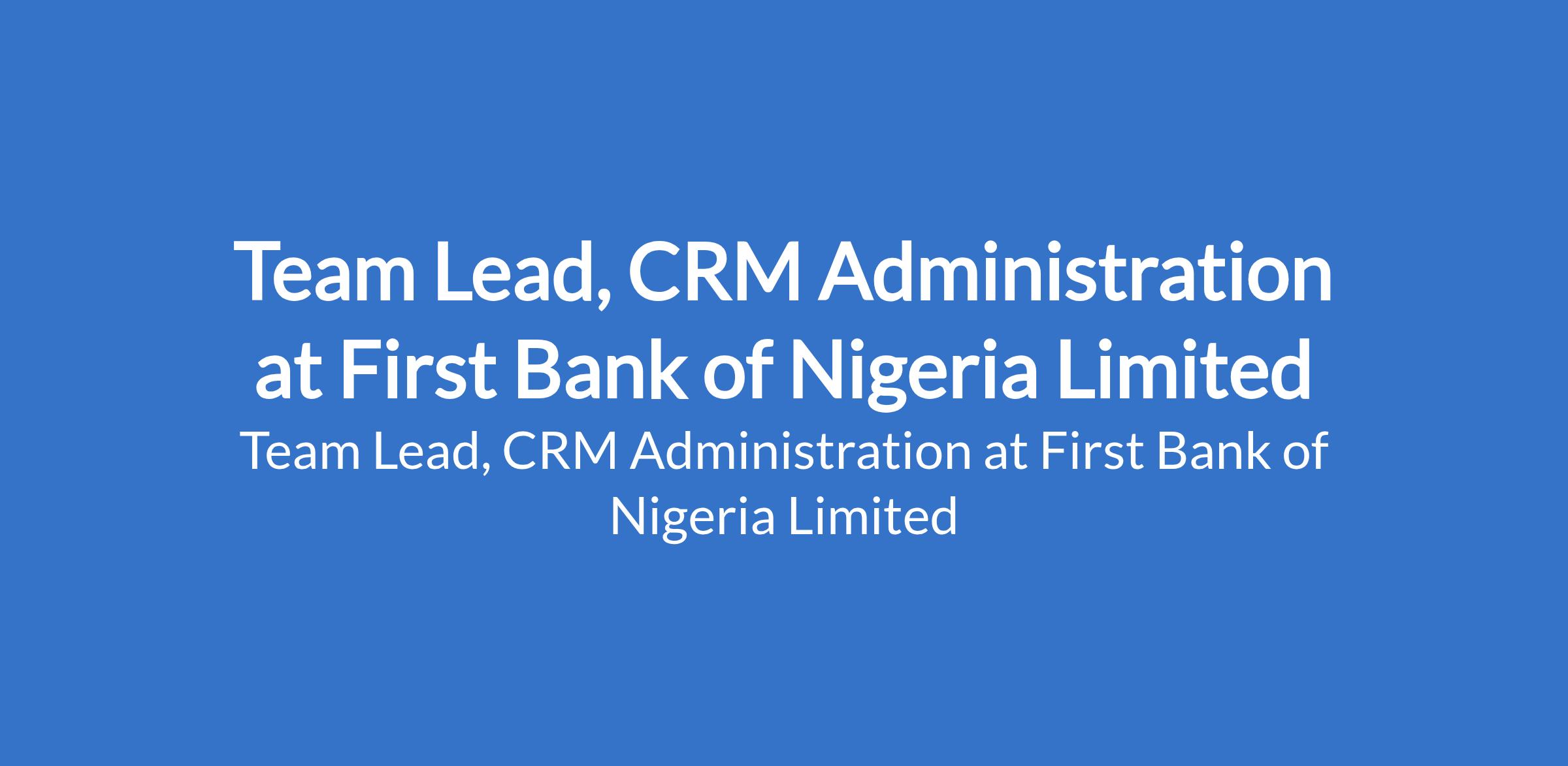 First Bank of Nigeria Limited is recruiting to fill the position of: Team Lead, CRM Administration. Interested candidates should possess a B.Sc. in Computer Science, IT, or other relevant discipline with experience in marketing/sales administration or customer relationship/customer experience management roles.