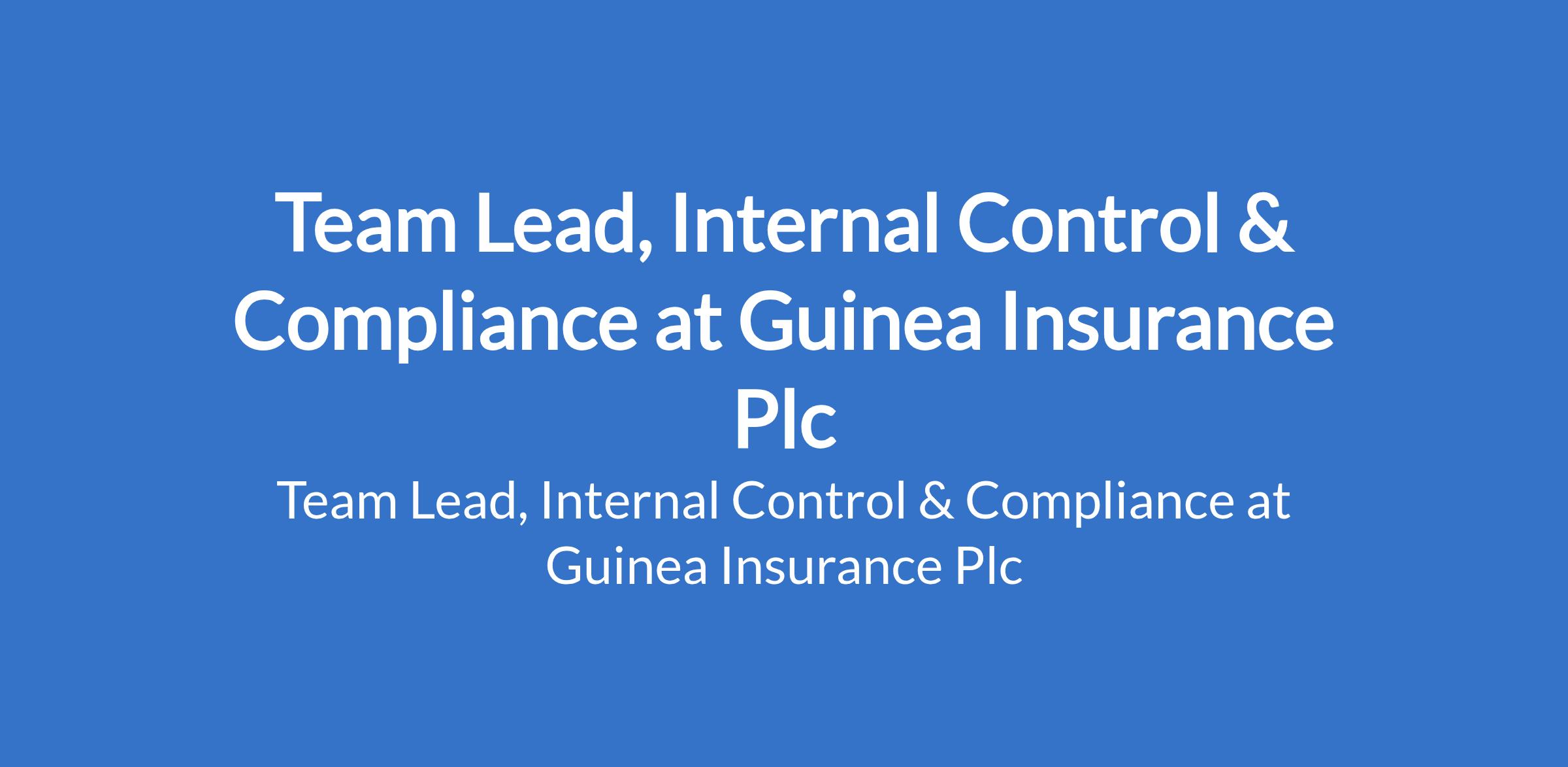Guinea Insurance Plc is recruiting to fill the position of: Team Lead, Internal Control & Compliance. The position is located in Lagos State. Interested candidates should possess a BSc / BA in Law, Finance, Business Administration or a related field with 8 to 10 year's experience in compliance and internal control.