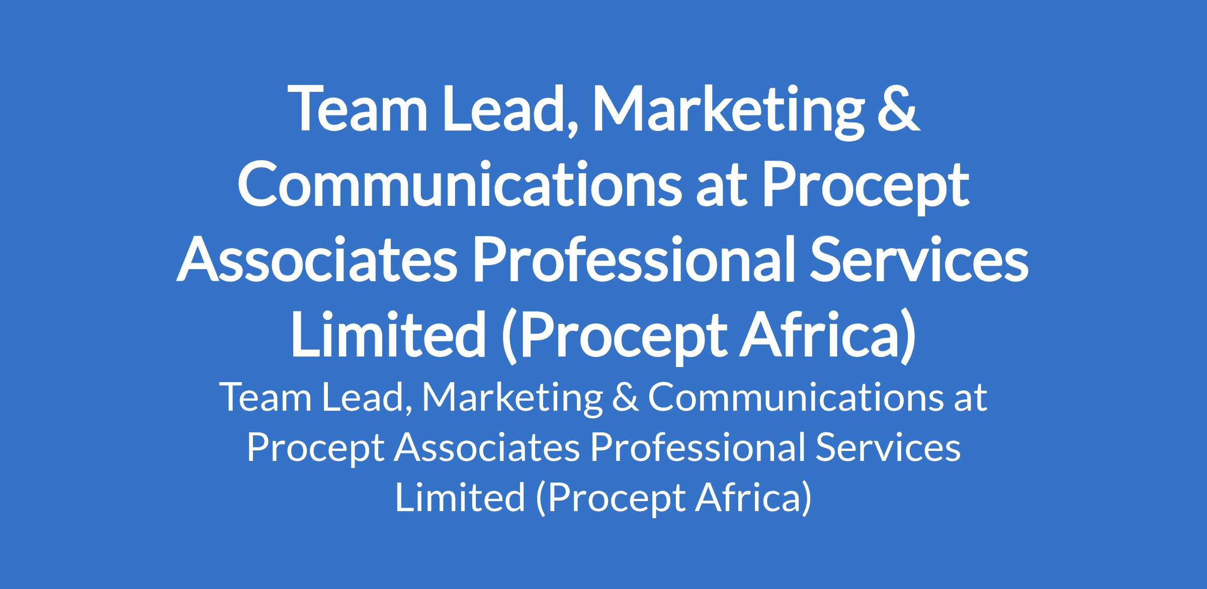 Procept Associates Professional Services Limited (Procept Africa) is recruiting to fill the position of: Team Lead, Marketing & Communications. The position is located in Igbobi, Lagos State. Interested candidates should possess a Bachelors Degree in Marketing, Communications, Business Administration, or a related field with a minimum of 5 years of progressive experience in marketing and communications, preferably within professional services, consulting, outsourcing, or training/e-learning sectors.