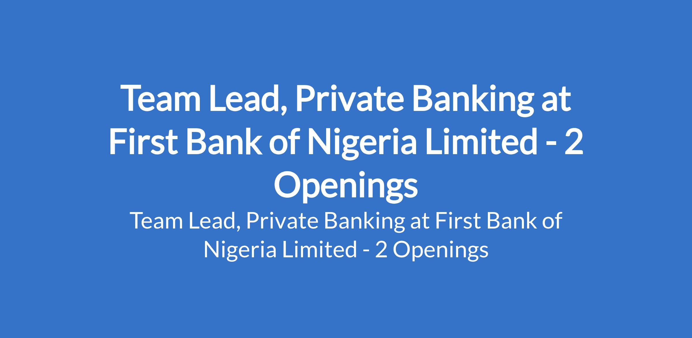 First Bank of Nigeria Limited is recruiting to fill the position of: Team Lead, Private Banking. The position is located in Onitsha - Anambra and Owerri - Imo States. Interested candidates should possess a First Degree (B.Sc, B.A etc.) with 8 - 12 years working experience in private banking or in a similar role.
