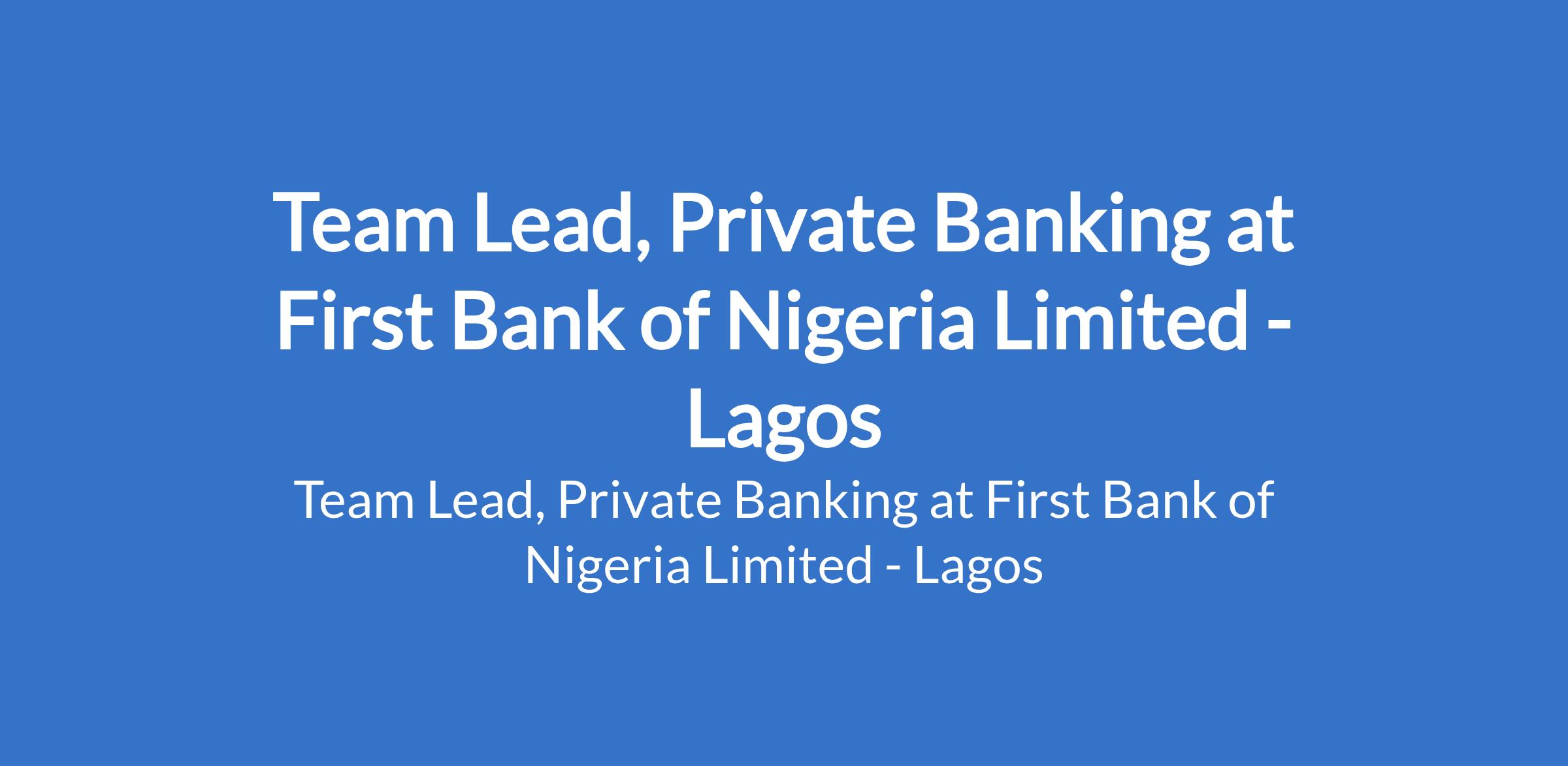First Bank of Nigeria Limited is recruiting to fill the position of: Team Lead, Private Banking. The position is located in Lagos State. Interested candidates should possess a First Degree (B.Sc, B.A etc.) with 8 - 12 years working experience in private banking or in a similar role.
