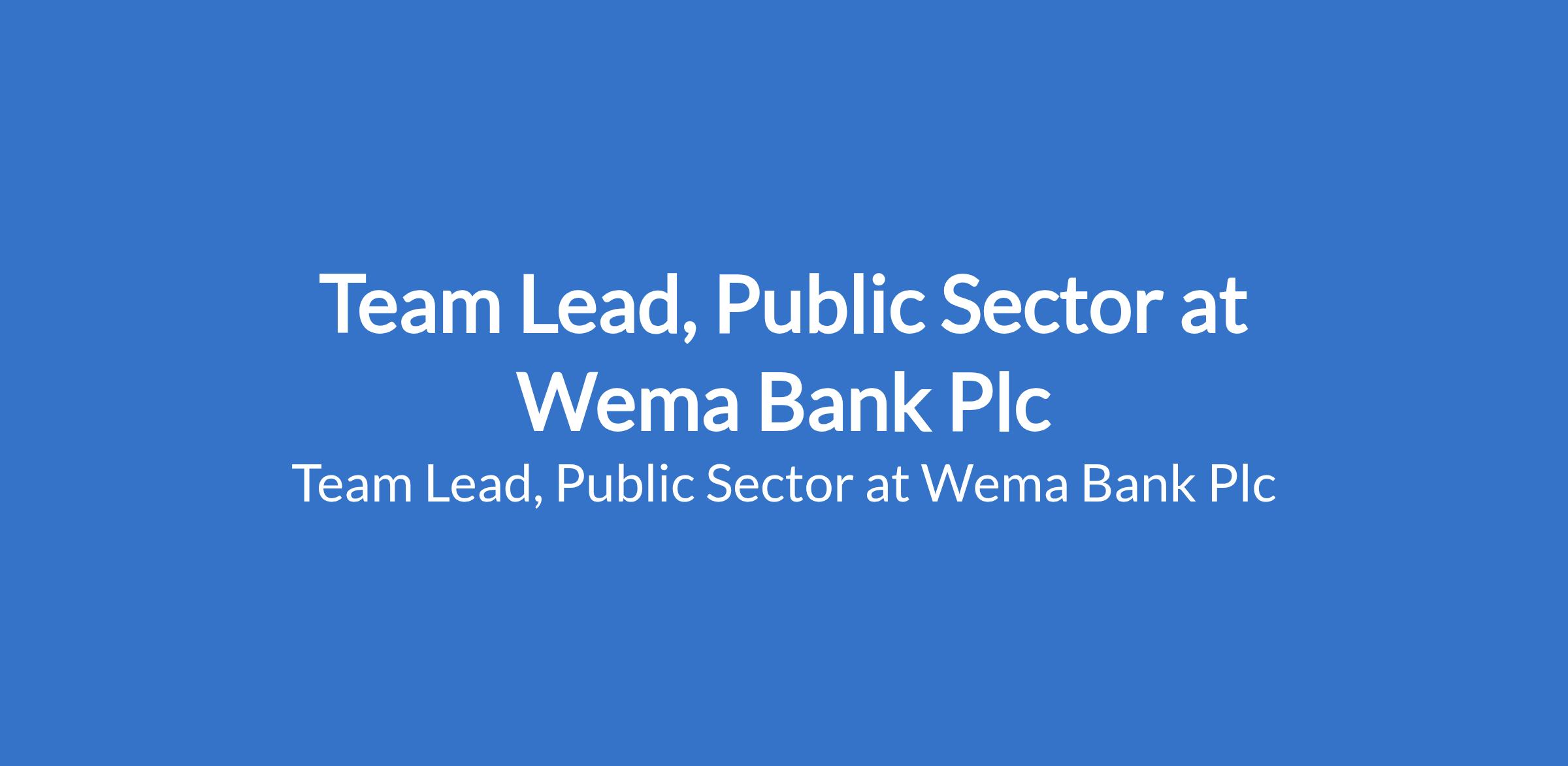 Wema Bank Plc is recruiting to fill the position of: Team Lead, Public Sector. The position is located in Rivers State. Interested candidates should possess a minimum of First Degree in any discipline with a minimum of 7 years and above cognate experience, preferably in the public sector, commercial, or corporate banking.