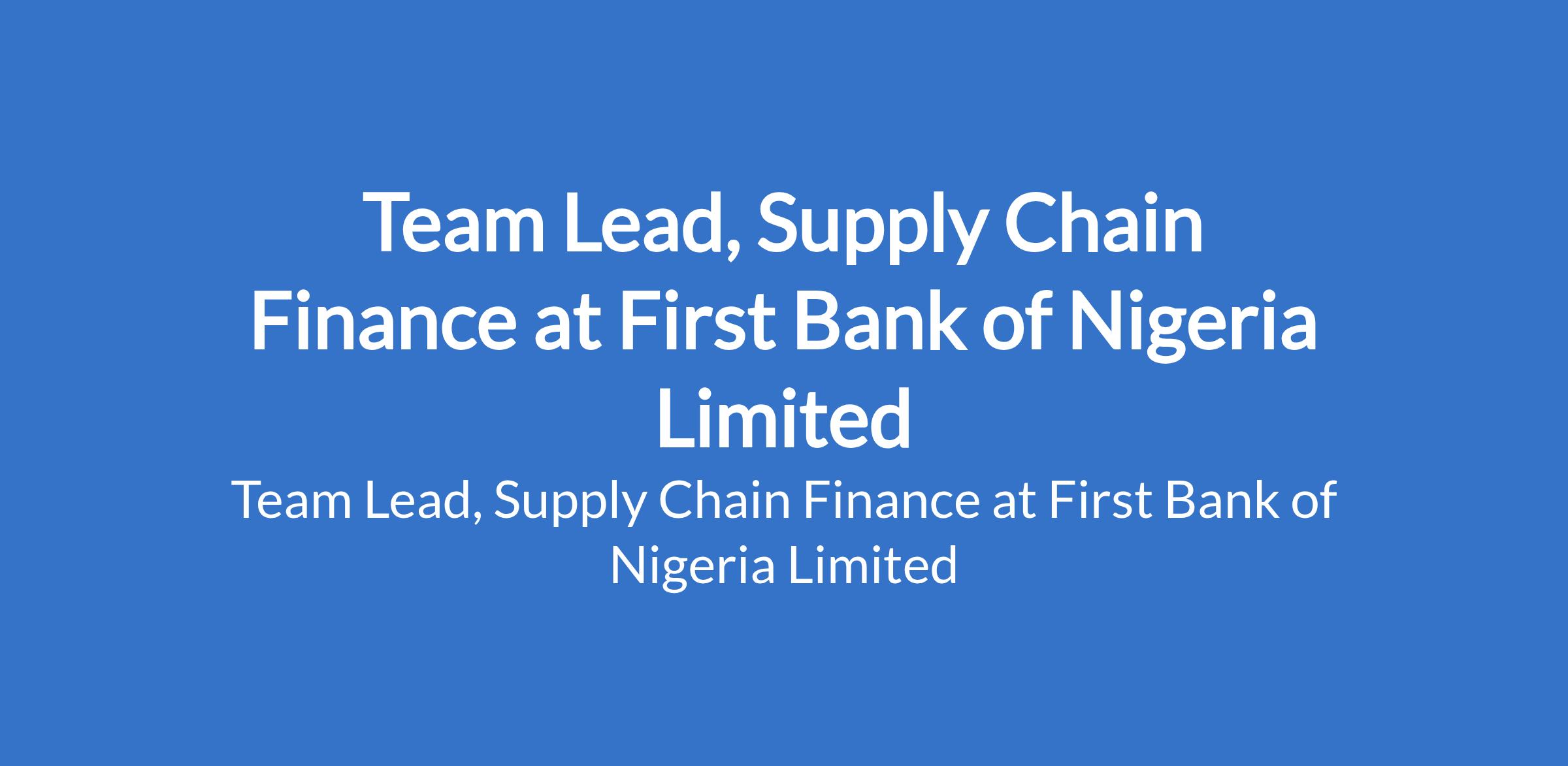First Bank of Nigeria Limited is recruiting to fill the position of: Team Lead, Supply Chain Finance. The position is located in Lagos State. Interested candidates should possess a Degree in a Business related discipline with five years relevant experience.