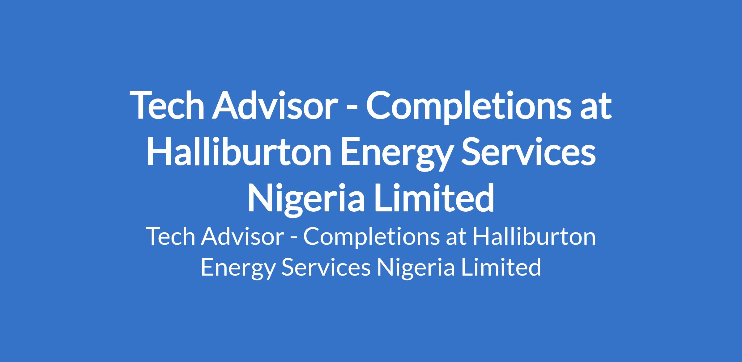 Halliburton Energy Services Nigeria Limited is recruiting to fill the position of: Tech Advisor - Completions. The position is located in Victoria Island, Lagos State. Interested candidates should possess an Undergraduate Degree in Petroleum or Mechanical Engineering with 10 - 15 years of oil field service experience including experience in business development and experience managing the work of others.