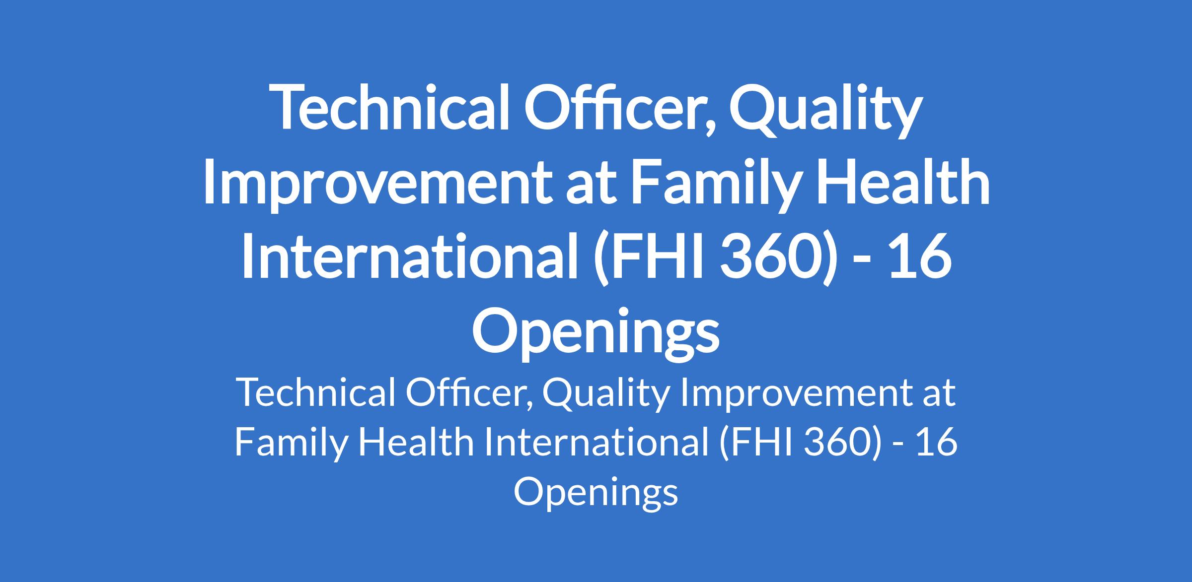 Family Health International (FHI 360) is recruiting to fill the position of: Technical Officer, Quality Improvement. The position is located in Alkaleri, Bauchi, Dambam, Darazo, Dass, Giade, Gamawa, Ganjuwa, Itas-Gadau, Jamaare, Katagum, Kirfi, Misau, Ningi, Shira, and Toro - Bauchi State. Interested candidates should possess a Bachelors Degree in Nursing, Midwifery, Public Health, Community Health, or a related field with at least 4 years of experience supporting MNCH, Nutrition, PHC, or HIV programs.