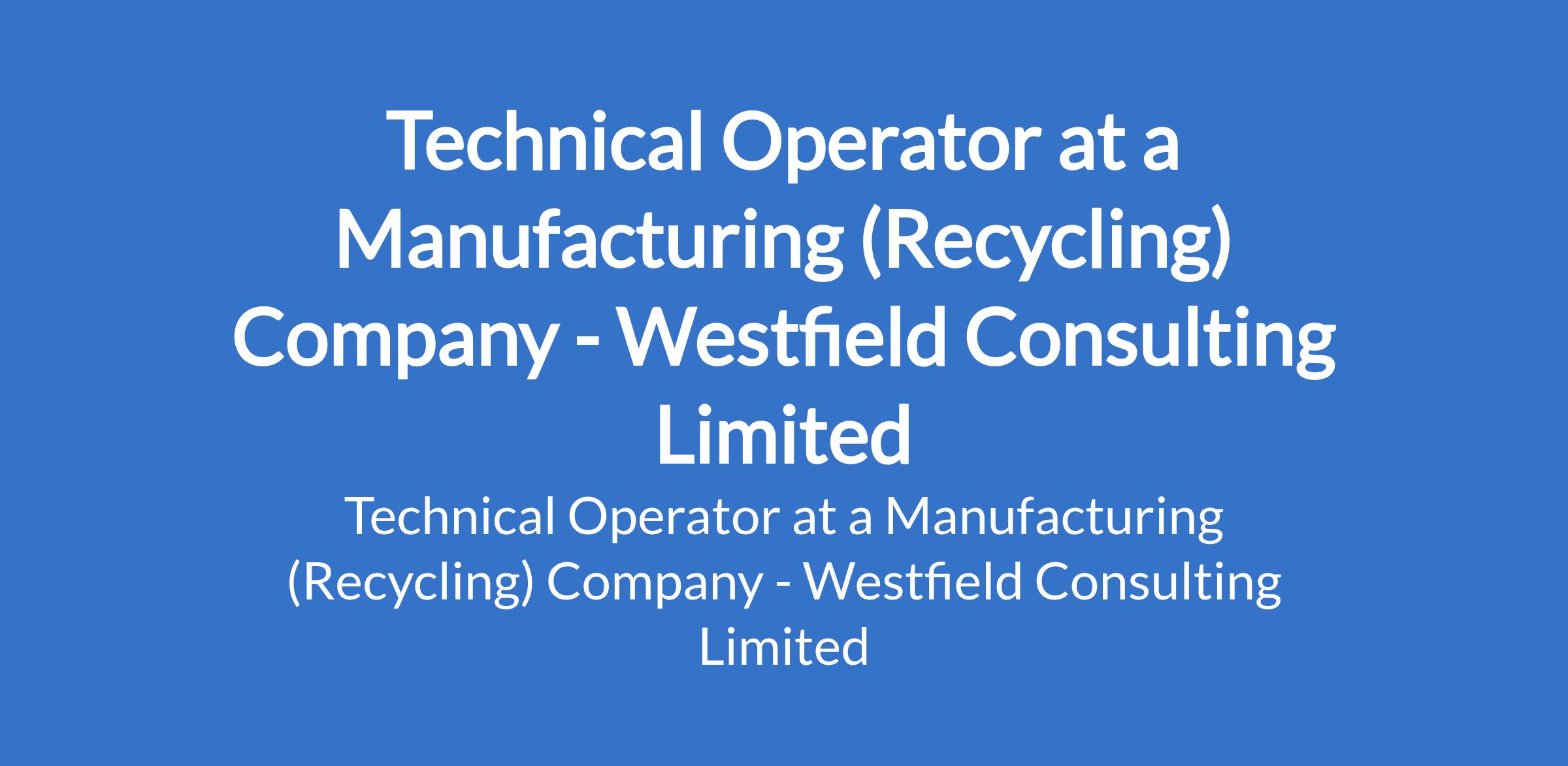Westfield Consulting Limited - Our client, a manufacturing (recycling) company, is recruiting to fill the position of: Technical Operator. The position is located in Mowe, Ogun State. Salary: N154,000 - N200,000 monthly. Interested candidates should possess an OND qualification / Trade Test certificate with minimum of 4 years of experience in the manufacturing industry.