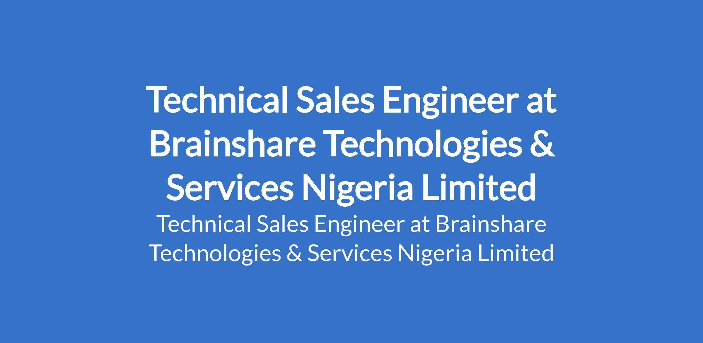 Brainshare Technologies & Services Nigeria Limited is recruiting to fill the position of: Technical Sales Engineer. The position is located in Lekki Phase 1, Lagos State. Interested candidates should possess a Bachelors Degree in Engineering, Information Technology, Computer Science, or a related field with a minimum of 3 years of experience in a Telecoms Company, with a focus on: Cloud services, Internet, and enterprise connectivity solutions.
