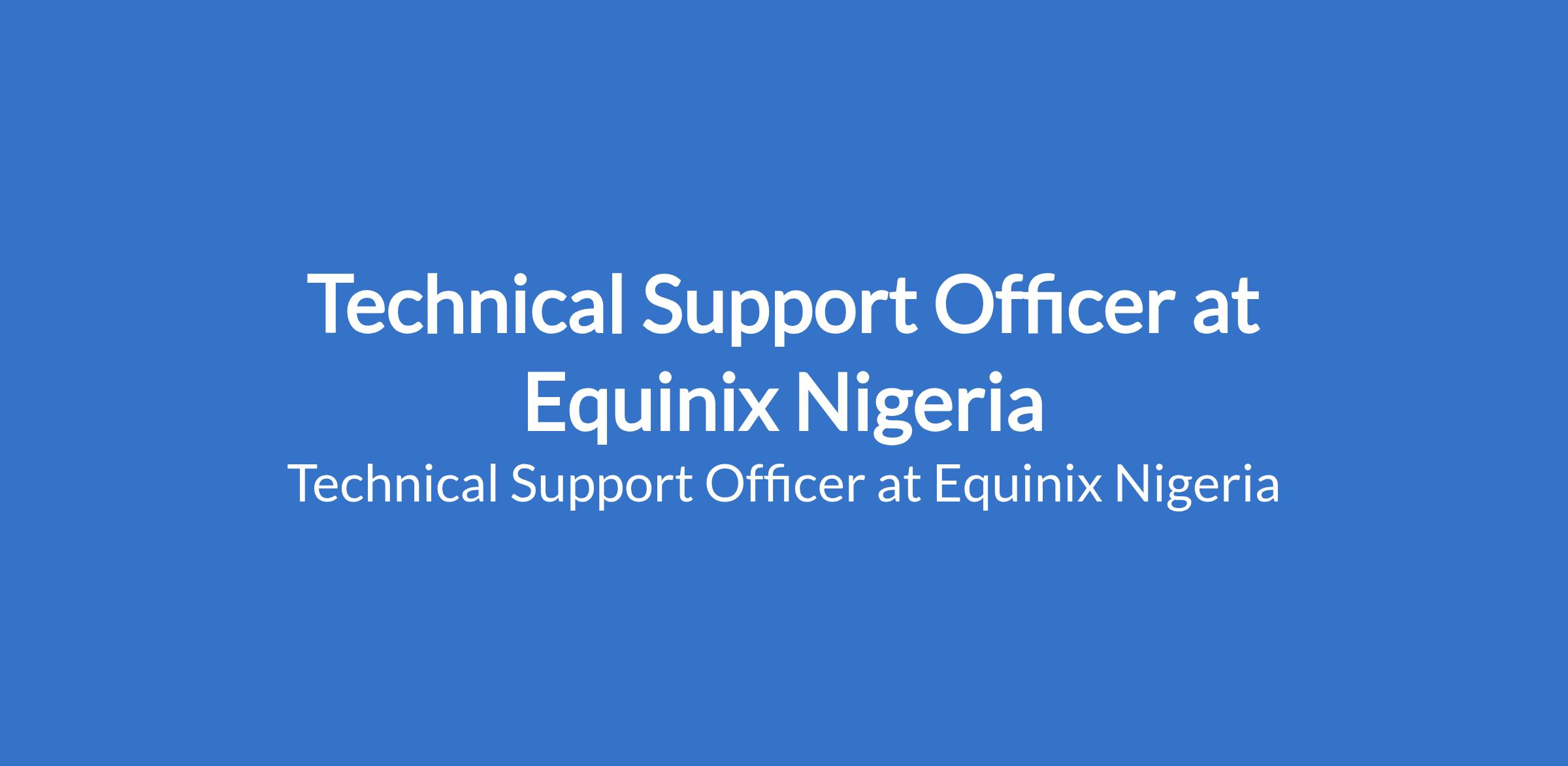Equinix Nigeria is recruiting to fill the position of: Technical Support Officer. The position is located in Benin, Edo State. Interested candidates should possess a B.Sc. / HND in a Computer Science, Engineering or any related field with 2-4 years related work experience.