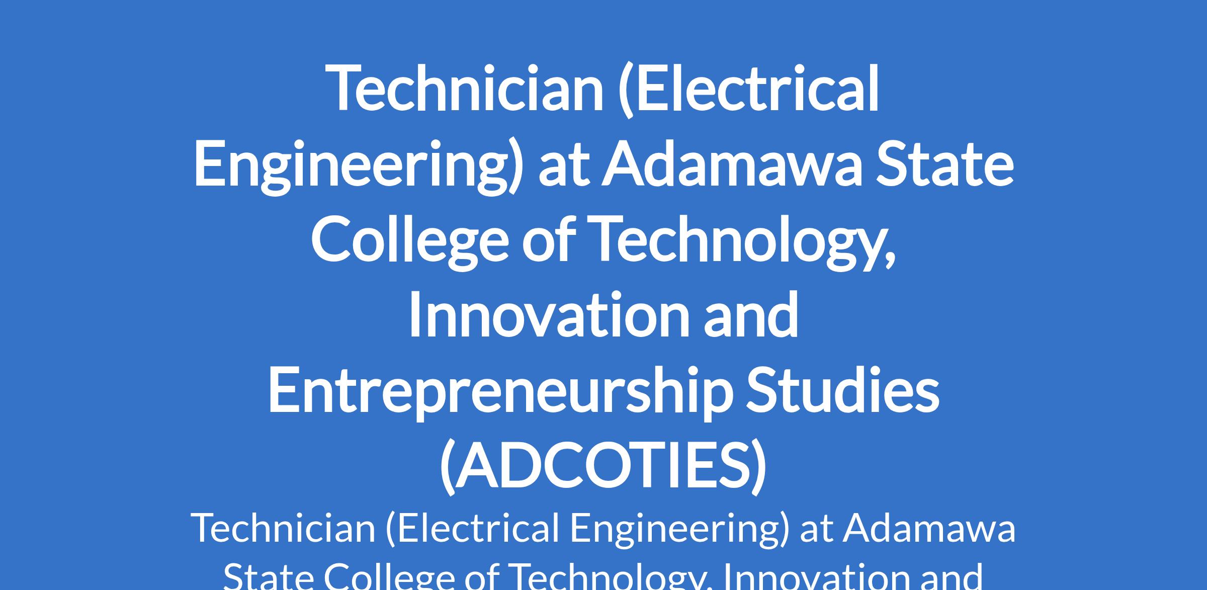 Adamawa State College of Technology, Innovation and Entrepreneurship Studies (ADCOTIES) is recruiting to fill the position of: Technician (Electrical Engineering). The position is located in Gulak, Adamawa State. Interested candidates should possess an ND at Credit Level from a recognised institution in Electrical Electronics Engineering.