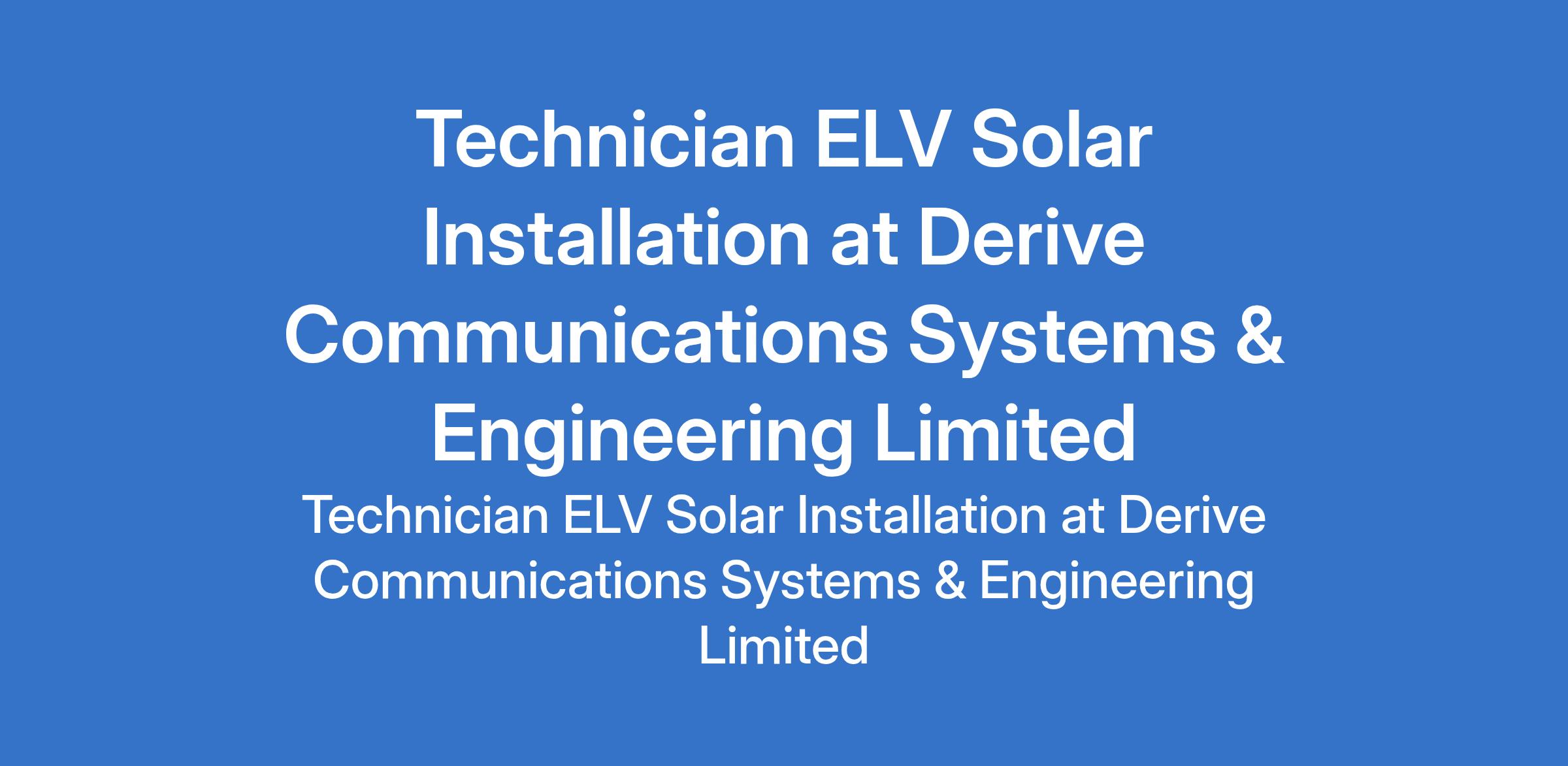 Derive Communications Systems & Engineering Limited is recruiting to fill the position of: Technician ELV Solar Installation. The position is located in Lugbe, Abuja (FCT). Interested candidates should possess a National Diploma in Electrical Engineering with a minimum of 3 years hands experience in ELV and solar installation.