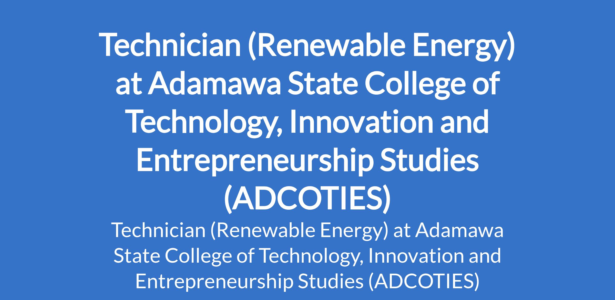 Adamawa State College of Technology, Innovation and Entrepreneurship Studies (ADCOTIES) is recruiting to fill the position of: Technician (Renewable Energy). The position is located in Gulak, Adamawa State. Interested candidates should possess an ND at Credit Level from a recognised institution in Renewable Energy or Power Engineering.