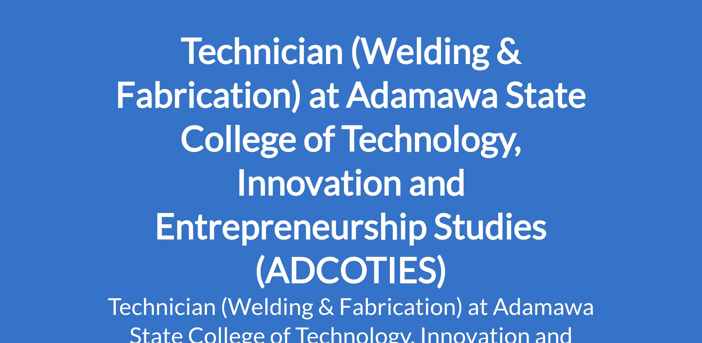 Adamawa State College of Technology, Innovation and Entrepreneurship Studies (ADCOTIES) is recruiting to fill the position of: Technician (Welding & Fabrication). The position is located in Gulak, Adamawa State. Interested candidates should possess an ND at Credit Level from a recognised institution in Technical Education (Welding & Fabrication).