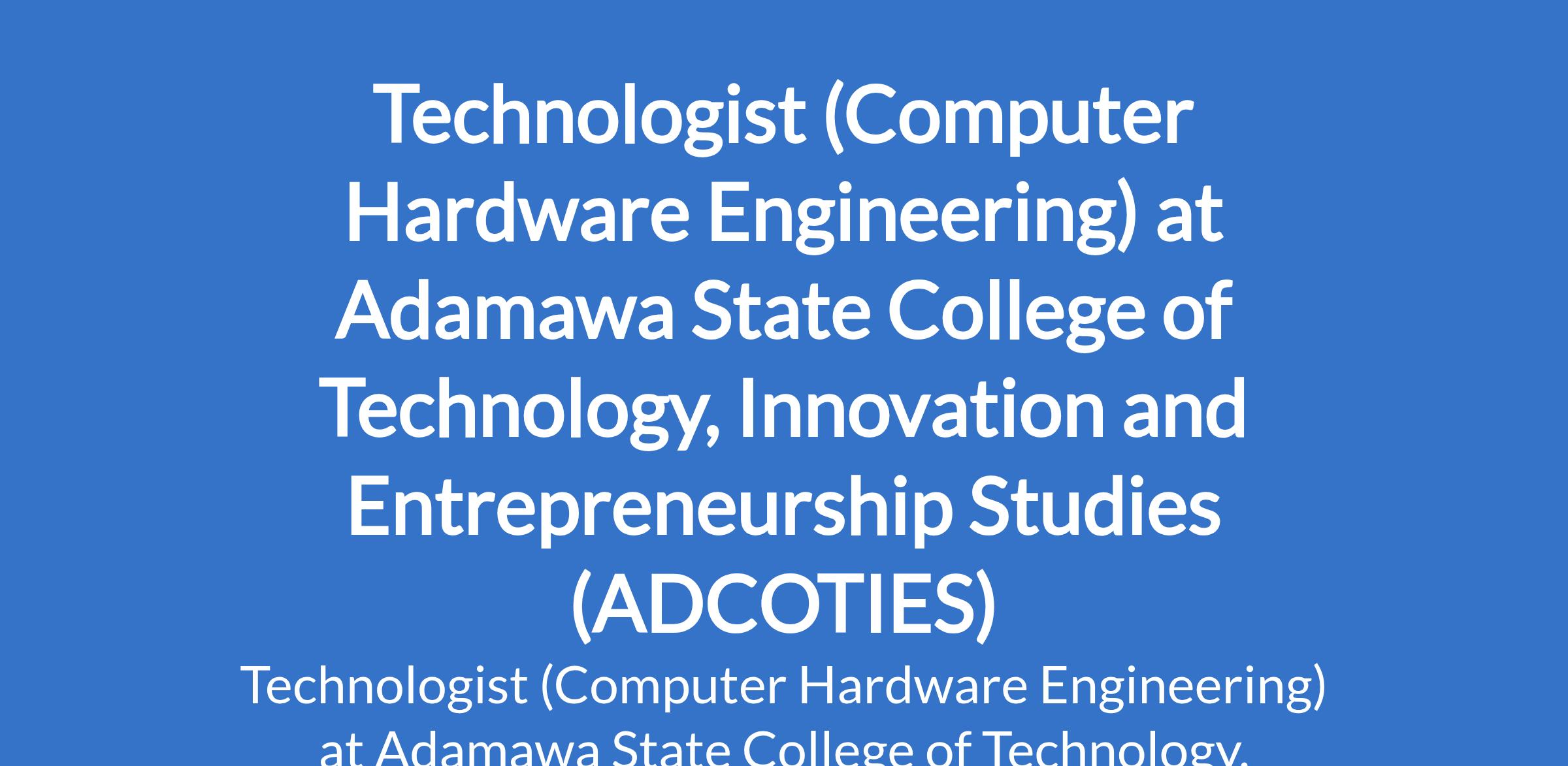 Adamawa State College of Technology, Innovation and Entrepreneurship Studies (ADCOTIES) is recruiting to fill the position of: Technologist (Computer Hardware Engineering). The position is located in Gulak, Adamawa State. Interested candidates should possess an HND (Distinction) in Computer Science, Computer Hardware Engineering with at least 3 years post qualification cognate work experience and registered with the relevant professional body.