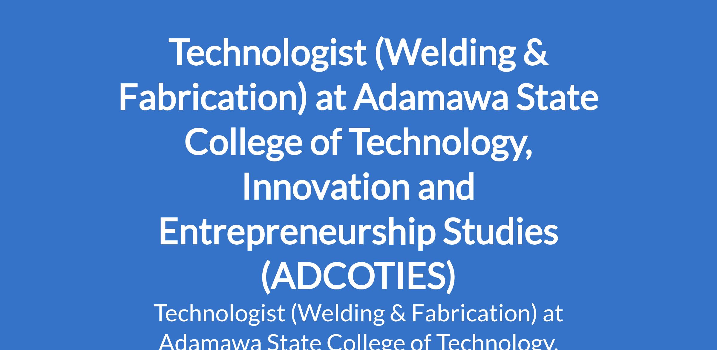 Adamawa State College of Technology, Innovation and Entrepreneurship Studies (ADCOTIES) is recruiting to fill the position of: Technologist (Welding & Fabrication). The position is located in Gulak, Adamawa State. Interested candidates should possess an HND (Distinction) in Technical Education (Welding & Fabrication), with at least 3 years post qualification cognate work experience and registered with the relevant professional body.