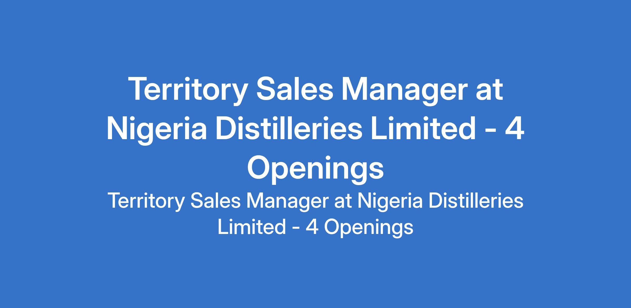 Nigeria Distilleries Limited is recruiting to fill the position of: Territory Sales Manager. The position is located in Afikpo - Ebonyi, Umuahia - Abia, Ado-Ekiti - Ekiti, and Lagos States. Interested candidates should possess an HND / Bachelor's Degree with 2+ years of sales experience within the FMCG/Manufacturing industry.