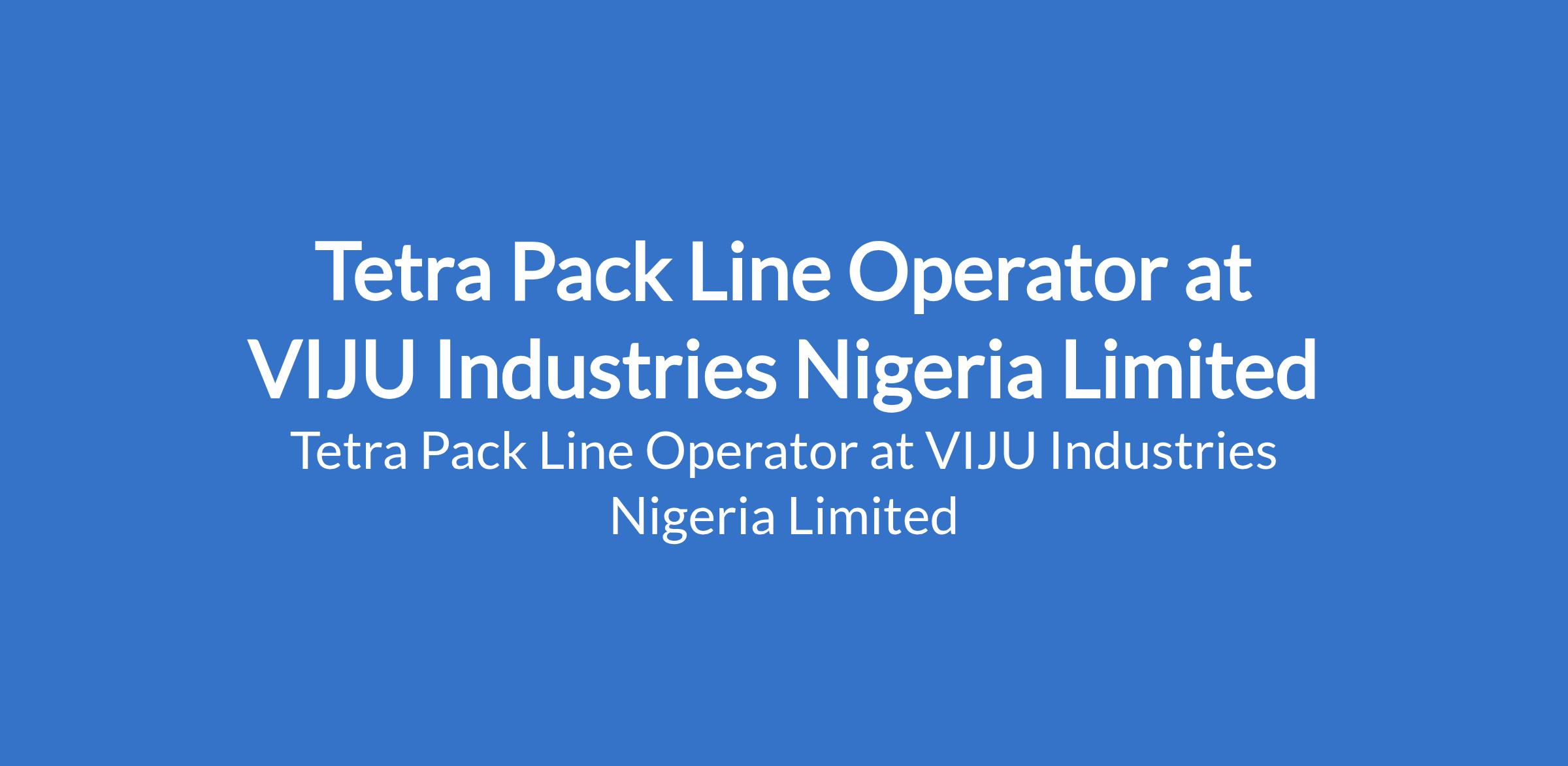 VIJU Industries Nigeria Limited is recruiting to fill the position of: Tetra Pack Line Operator. The position is located in Igbesa, Ogun State. Salary: N100,000 - N200,000 monthly. Interested candidates should possess a High School or Technical background with 3 years experience or above in food or beverage production.