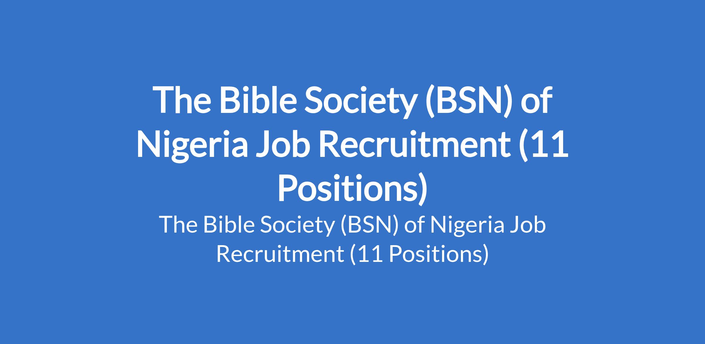 The Bible Society of Nigeria (BSN) is recruiting suitably qualified candidates to fill the following positions in Abuja, Plateau and Lagos States: Territorial Distribution Officer, Maintenance Assistant, Church & Public Relations Officer, Laundry Attendant (BGH), Warehouse Assistant, Driver, Guest Service Agent, Maintenance Officer, Porter, and Guest Room Attendant.