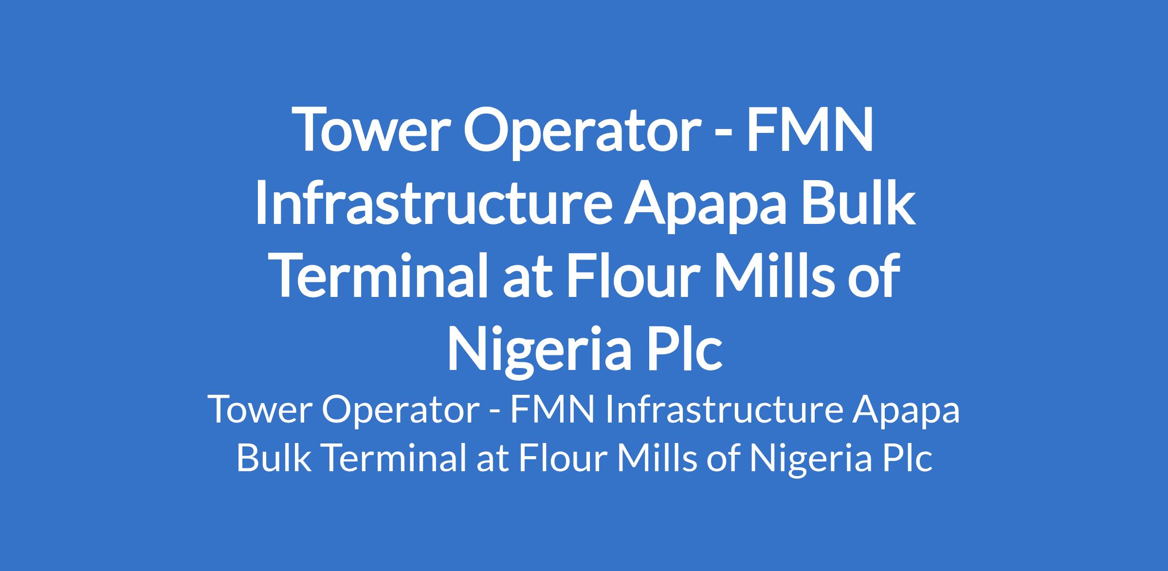 Flour Mills of Nigeria Plc is recruiting to fill the position of: Tower Operator - FMN Infrastructure Apapa Bulk Terminal. The position is located in Apapa, Lagos State. Interested candidates should possess a minimum of 5 OLevel credits, including Mathematics and English, with a minimum of 2 years cognate experience in a similar role.