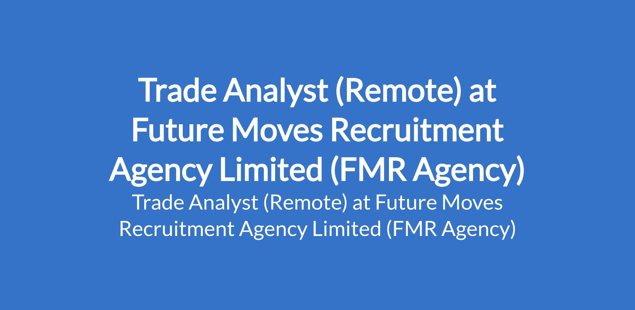 Future Moves Recruitment Agency Limited (FMR Agency) is recruiting to fill the position of: Trade Analyst. This is a remote job. Interested candidates should possess a BSc or HND qualification in Finance, Economics, Accounting, or related fields with experience in asset management, brokerage, fixed income, equities, or market research.