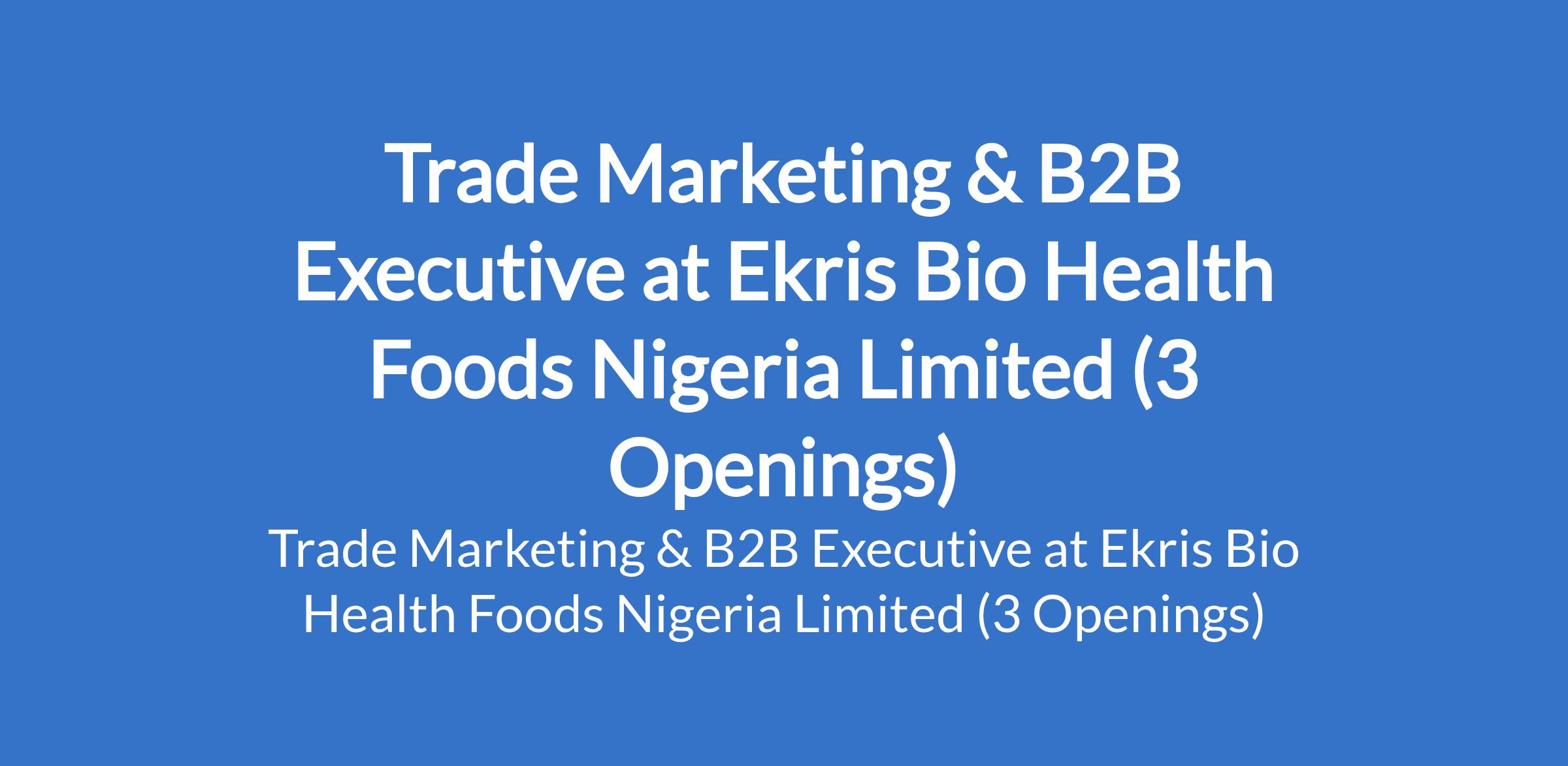 Ekris Bio Health Foods Nigeria Limited is recruiting to fill the position of: Trade Marketing & B2B Executive. The position is located in Abuja, Lagos and Port Harcourt - Rivers States. Interested candidates should possess a Bachelors Degree in Marketing, Business Administration, or a related field with 3 5 years of experience in Trade Marketing, B2B Sales, or FMCG / Hospitality sales.