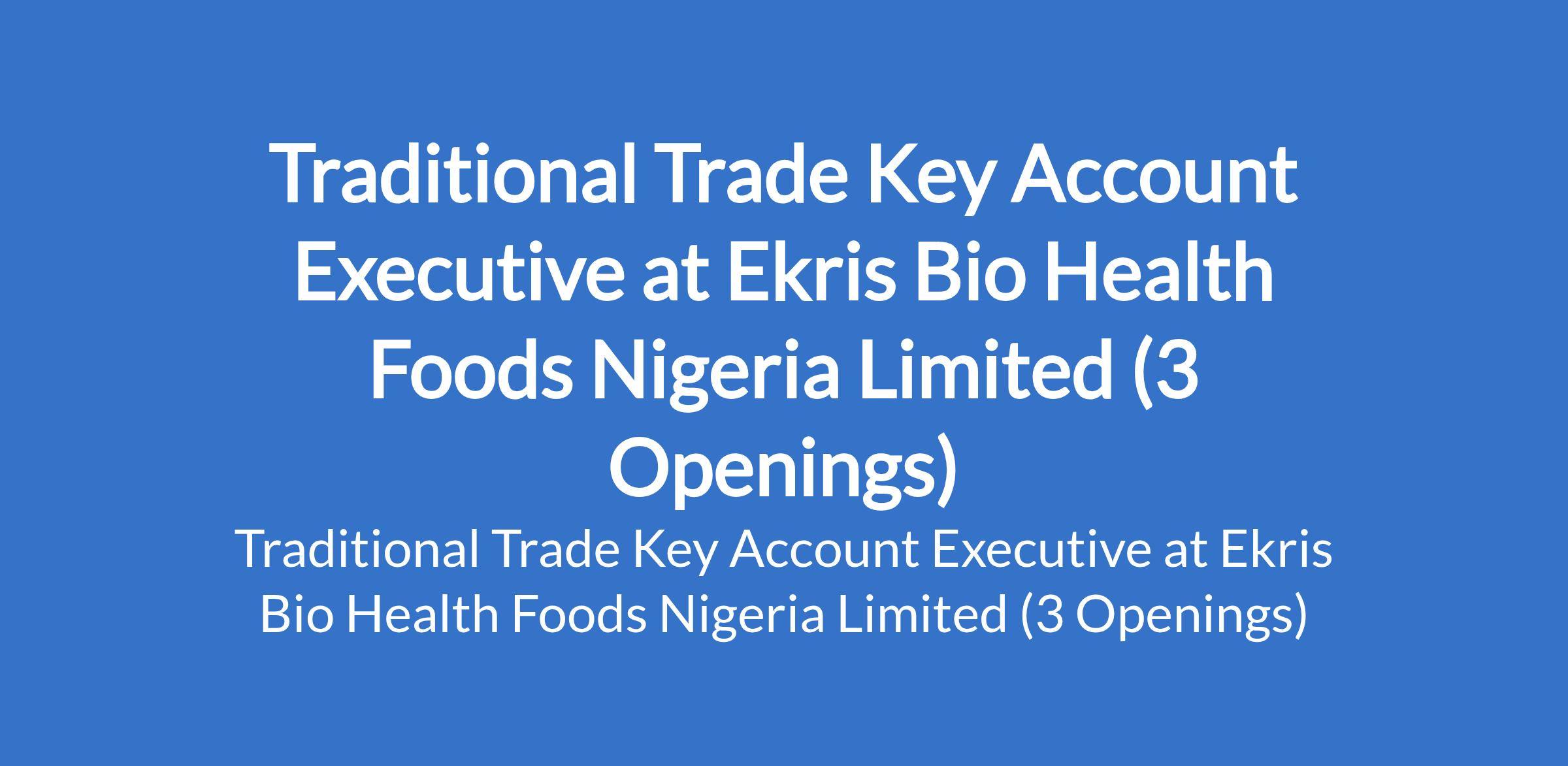 Ekris Bio Health Foods Nigeria Limited is recruiting to fill the position of: Traditional Trade Key Account Executive. The position is located in Abuja, Port Harcourt - Rivers and Lagos States. Interested candidates should possess a Bachelors Degree in Marketing, Business Administration, or related field with a minimum of 5 years experience in FMCG sales, specifically within the traditional trade (open market) channel.