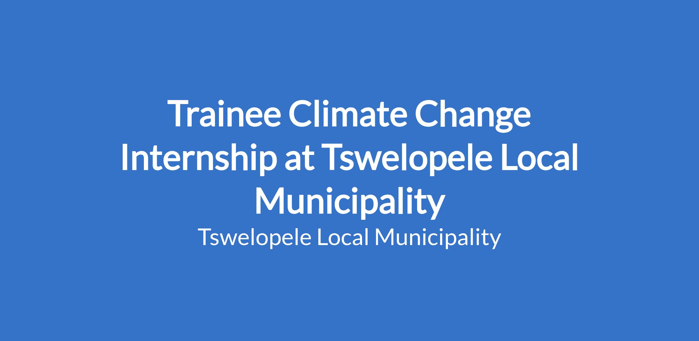 Tswelopele Local Municipality invites unemployed youths (18 - 35 Years) residing in Tswelopele to participate in the Climate Change Internship, Occupational Health and Safety Compliance Internship and Waste Management Internship. The candidate will have to undergo training for a period of 6 months which will afford them an opportunity to obtain workplace experience.