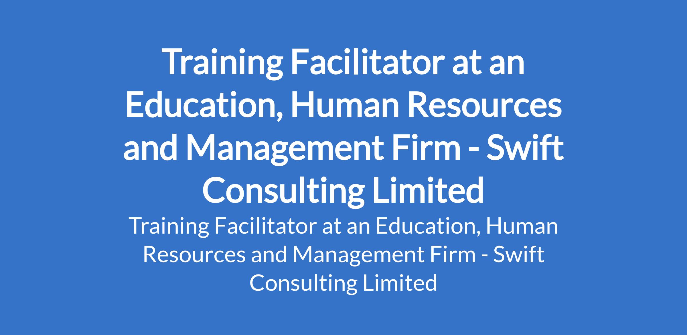 Swift Consulting Limited - Our client, an Education, Human Resources and Management firm is recruiting to fill the position of: Training Facilitator. The position is located in Owerri, Imo State. Interested candidates should possess relevant qualifications.