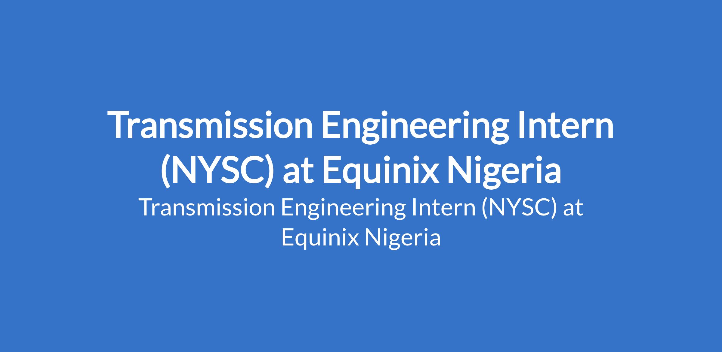 Equinix Nigeria is recruiting to fill the position of: Transmission Engineering Intern (NYSC). The position is located in Victoria Island, Lagos State. Interested candidates should be graduates with a minimum of a Second-Class Upper qualification or equivalent in Computer Science, Mechanical Engineering, Electrical / Electronics Engineering or Telecommunications Engineering and must be currently enrolled in the NYSC program, posted to Lagos for service and are looking for a Place of Primary Assignment (PPA).