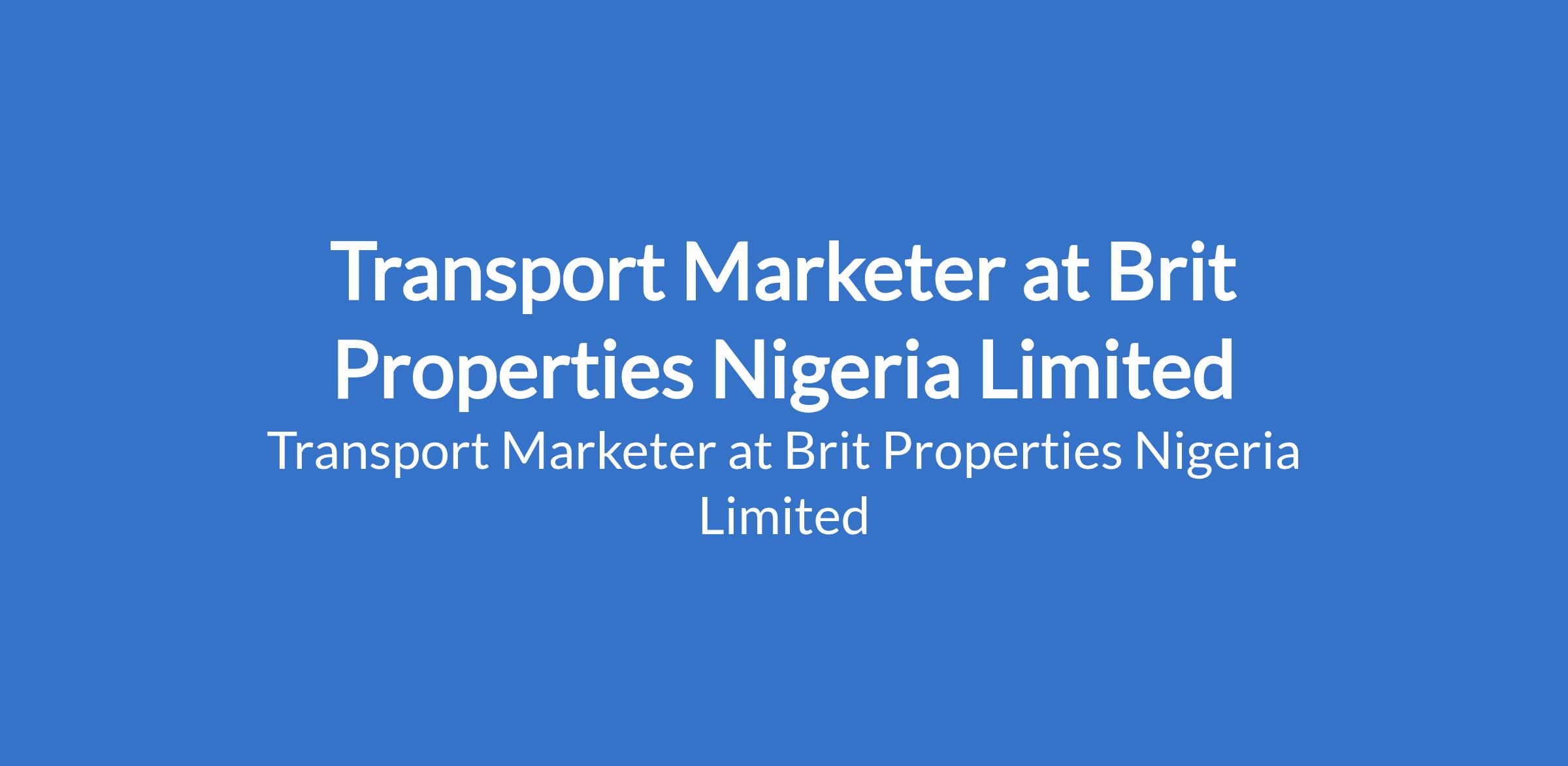 Brit Properties Nigeria Limited is recruiting to fill the position of: Transport Marketer. The position is located in Ajah, Lagos State. Interested candidates should possess a minimum of OND / HND / Bachelors Degree in Marketing, Business Administration, or related fields with 2+ years experience in marketing, preferably in transport, logistics, or field sales.