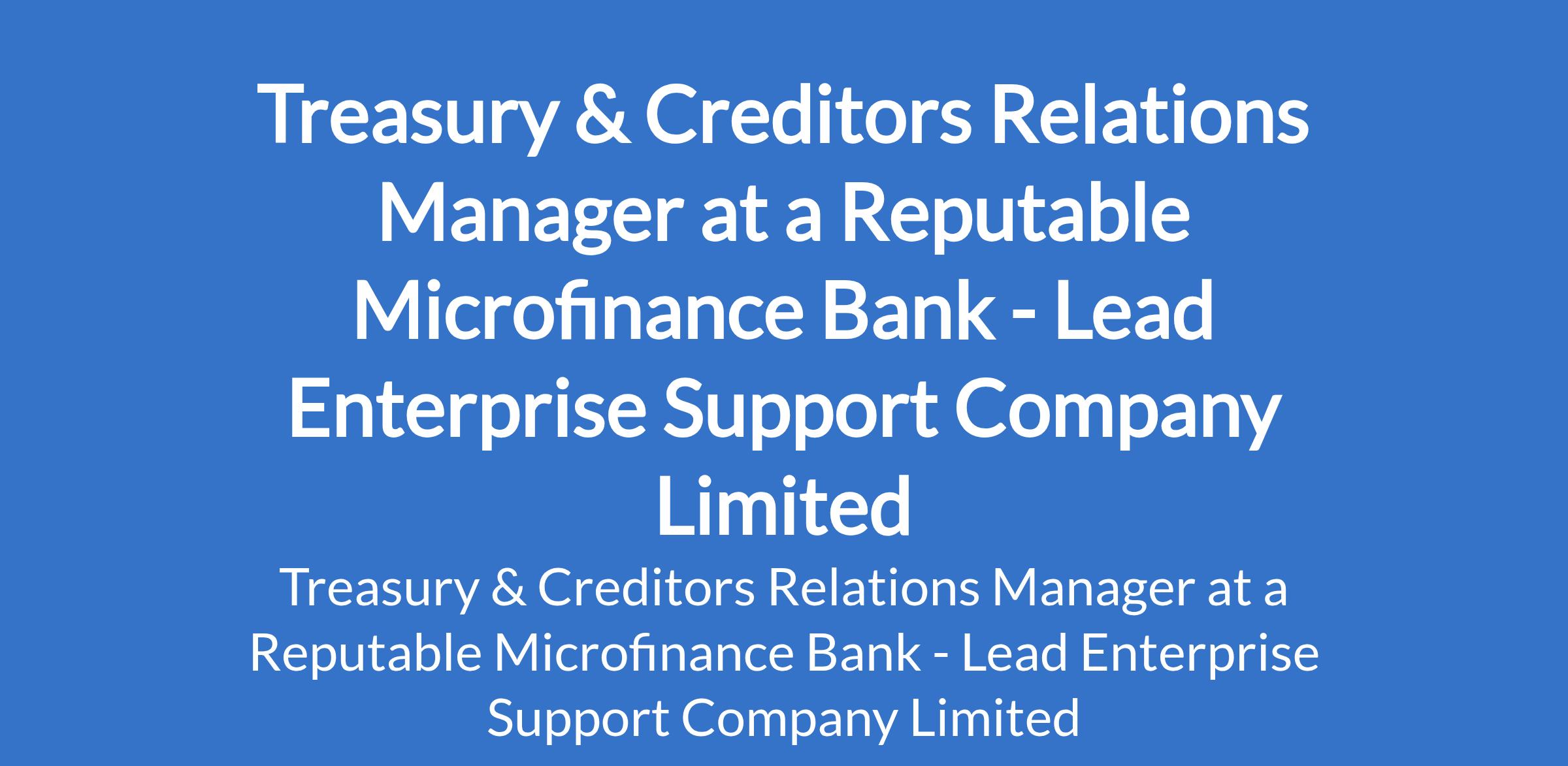 Lead Enterprise Support Company Limited - Our client, a reputable Microfinance Bank is recruiting to fill the position of: Treasury & Creditors Relations Manager. The position is located in Maryland, Lagos State. Interested candidates should possess a Bachelors Degree in Finance, Accounting, Economics, or a related discipline, professional certification (ACA, ACCA, CFA, or equivalent) is an added advantage with 712 years relevant work experience in treasury, funding, or banking operations within a regulated financial institution, preferably a Microfinance Bank.