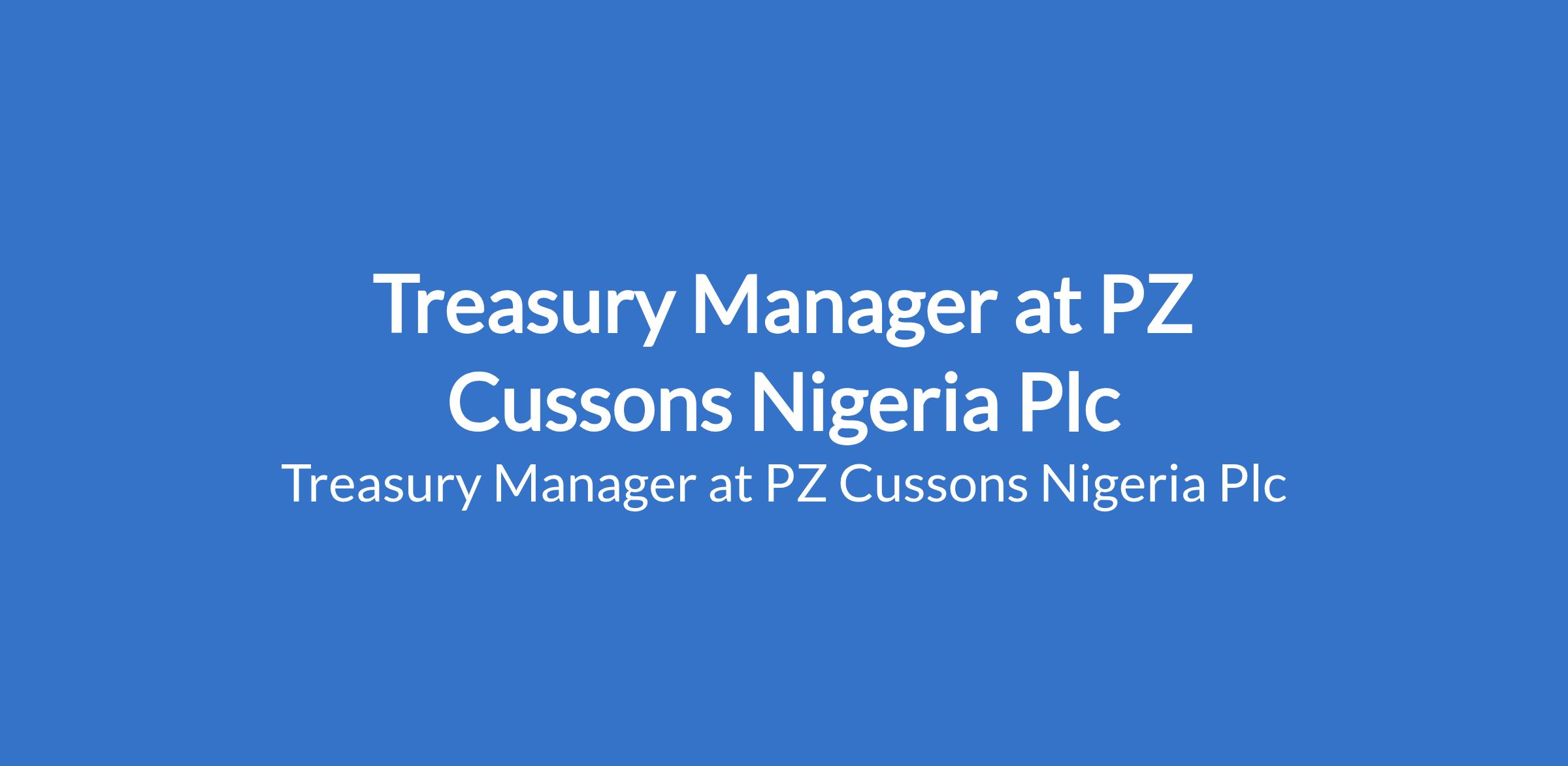 PZ Cussons Nigeria Plc is recruiting to fill the position of: Treasury Manager. Interested candidates should possess a First Degree in Accounting, Finance, Economics, or a related field, professional certification or progress (e.g. ACA, ACCA, CFA) is an added advantage with 25 years of relevant experience in treasury, finance, or accounting; experience with treasury management systems (TMS) is an asset.