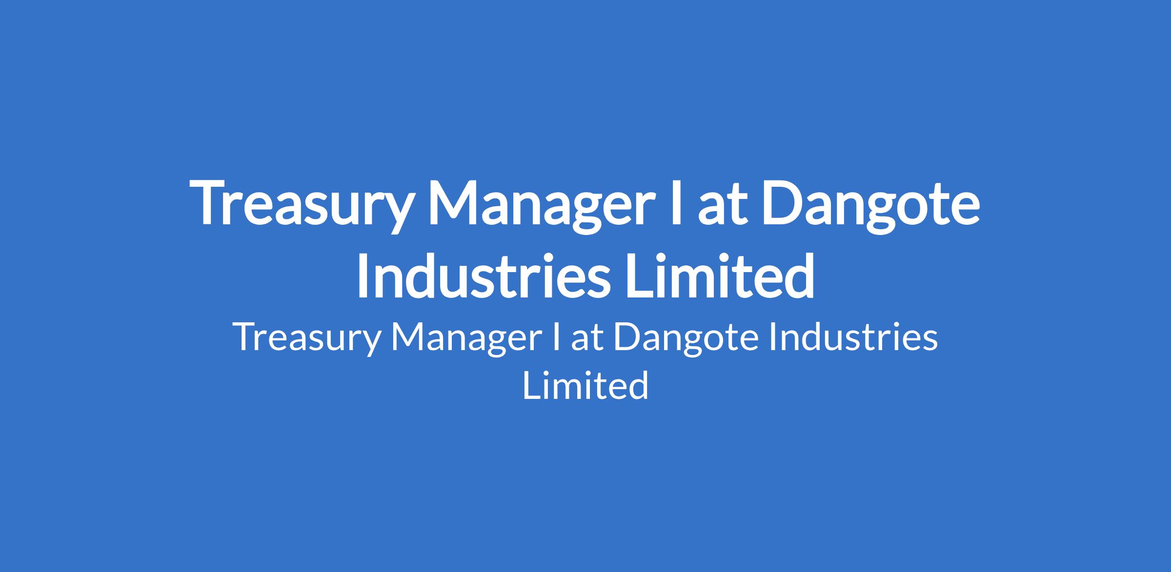 Dangote Industries Limited is recruiting to fill the position of: Treasury Manager I. Interested candidates should possess a Bachelors Degree in Accounting, Economics or other related disciplines with a minimum of ten (10) years relevant work experience.