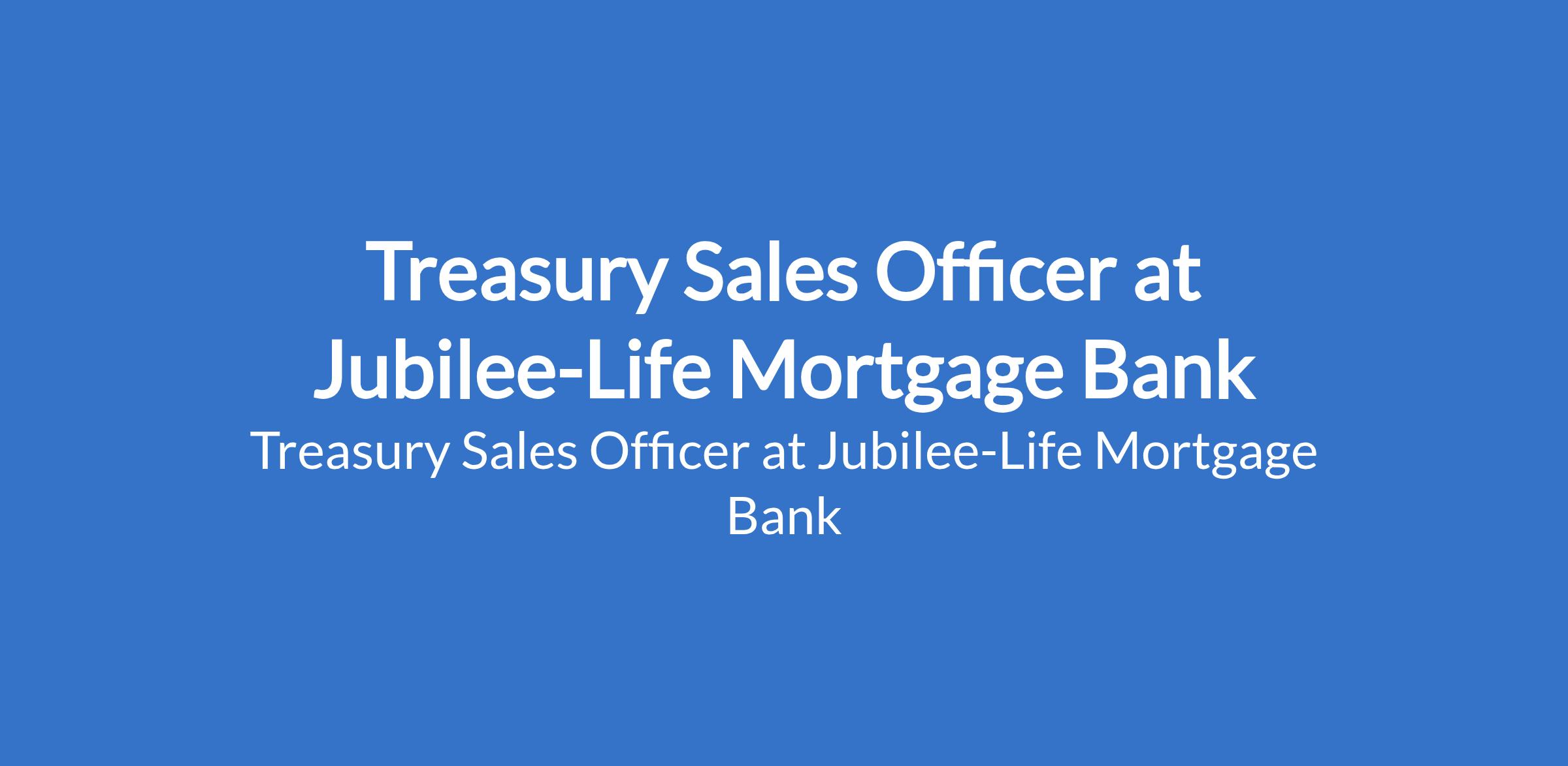 Jubilee-Life Mortgage Bank is recruiting to fill the position of: Treasury Sales Officer. The position is located in Victoria Island, Lagos State. Salary: N14,000,000 - N16,000,000 annually. Interested candidates should possess a minimum of First Degree in Finance, Economics, Business Administration, Banking, or related discipline; professional certifications such as CFA, CIS, ACA, ACCA, or relevant capital market certifications with a minimum of 7 years experience in treasury sales, investment banking, asset management, or financial markets.