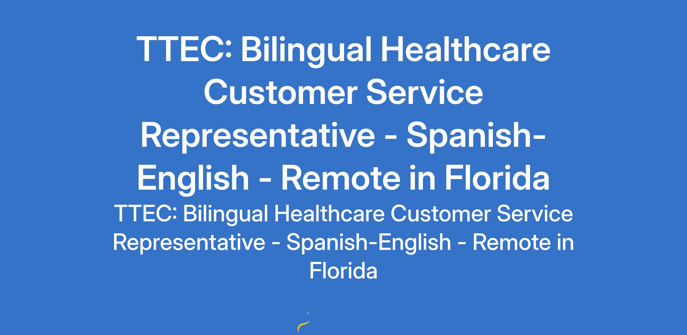 Your potential has a place here with TTEC's award-winning employment experience. As a Bilingual Healthcare Customer Service Representative - Spanish-English, working remotely in Florida, you'll be a part of bringing humanity to business Our employees have spoken. Our purpose, team, and company culture are amazing and our Great Place to Work certification in the United States says it all! What You'll be Doing Do you have a passion for helping others? Whether it's getting answers for customers quickly, consulting on products with compassion or finding resolutions for their issues with a smile, you'll be the difference between their customer experience being just average or an exceptional one. During a Typical Day, You'll Answer incoming communications from customers Conduct research to provide answers for customers to resolve their issues What You Bring to the Role 6 months or more of customer services experience Bilingual in Spanish and English High school diploma or equivalent Computer experience High speed internet (> 15 mbps) While we recommend a USB wired headset, if you have a headset already, you may be able to use that (except for Bluetooth headsets) Smart phone or another device that runs IOS or Android (iPad etc.) for your daily log-in What You Can Expect Supportive of your career and professional development An inclusive culture and community minded organization where giving back is encouraged A global team of curious lifelong learners guided by our company values Base wage starting at $17 per hour plus performance bonus opportunities And we have a healthy benefits package based on your position that could include PTO, tuition reimbursement, health and wellness incentives Visit for more information. A Bit More About Your Role We're committed to ensuring you have the skills and support to be successful in your role throughout your career. From your first day in training, through individualized webcam-enabled, engagement and coaching, on into 1000s of free courses to support your career growth wherever that may take you. And we know that you bring with you the one necessary ingredient that can't be taught - a caring and supportive nature that will shine through as you help customers. Our TTEC community is here for you as one dynamic, global family. You'll report to a Team lead. You'll contribute to the success of the customer experience and the overall success of the team. About TTEC Our business is about making customers happy. That's all we do. Since 1982, we've helped companies build engaged, pleased, profitable customer experiences powered by our combination of humanity and technology. On behalf of many of the world's leading iconic and hypergrowth brands, we talk, message, text, and video chat with millions of customers every day. These exceptional customer experiences start with you. TTEC is proud to be an equal opportunity employer where all qualified applicants will receive consideration for employment without regard to race, color, religion, sex, sexual orientation, gender identity, national origin, disability, or status as a protected veteran. TTEC embraces and is committed to building a diverse and inclusive workforce that respects and empowers the cultures and perspectives within our global teams. We aim to reflect the communities we serve, by not only delivering amazing service and technology, but also humanity. We make it a point to make sure all our employees feel valued, belonging, and comfortable being their authentic selves at work. As a global company, we know diversity is our strength because it enables us to view things from different vantage points and for you to bring value to the table in your own unique way.