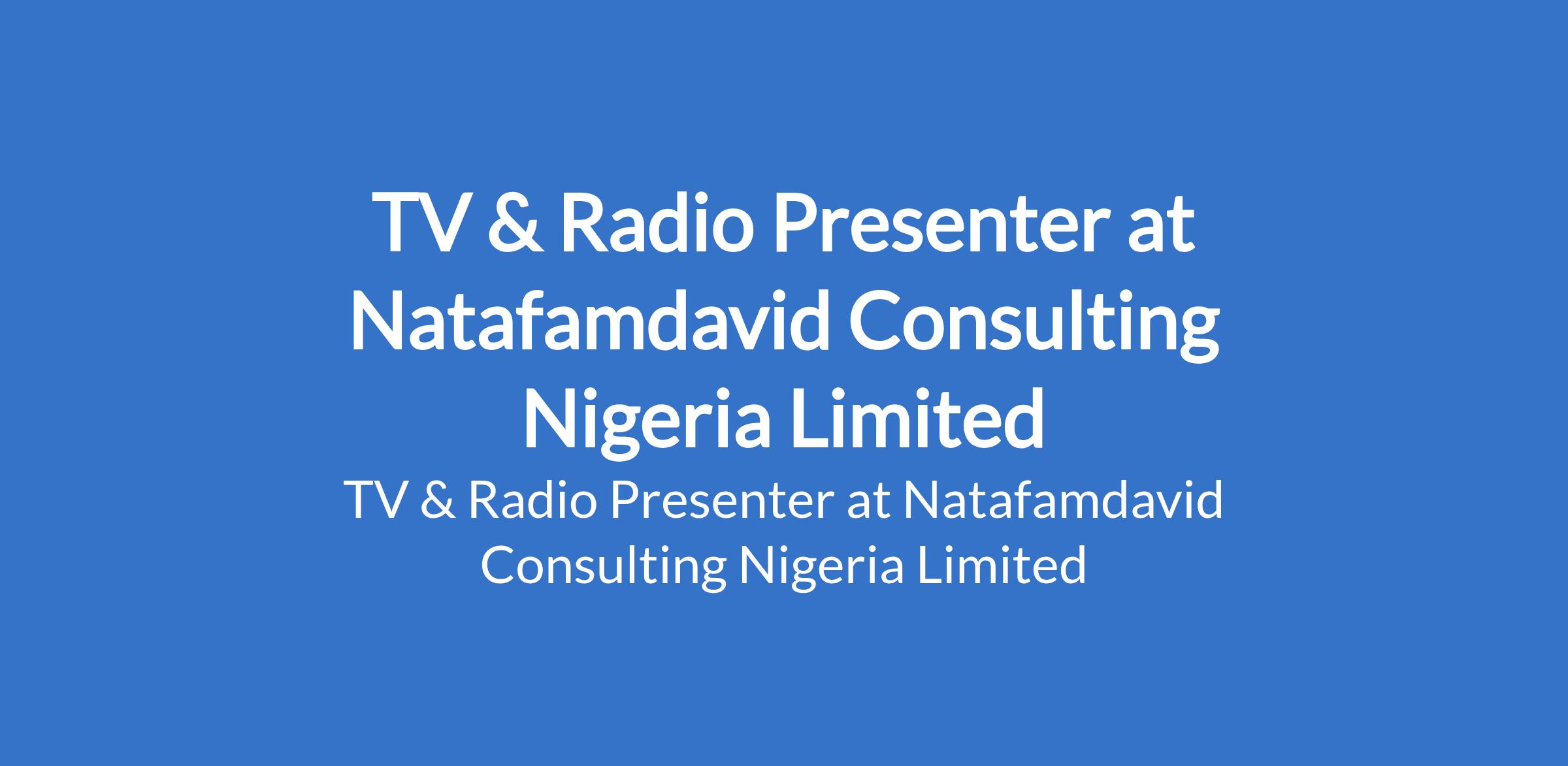 Natafamdavid Consulting Nigeria Limited is recruiting to fill the position of: TV & Radio Presenter. The position is located in Ikeja, Lagos State. Interested candidates should possess a minimum of HND/B.Sc Degree in Mass Communication, Theatre Arts, English, Broadcasting, or related fields with 23 years experience in presenting, broadcasting, media, or public speaking (fresh talents with exceptional skills may also apply).