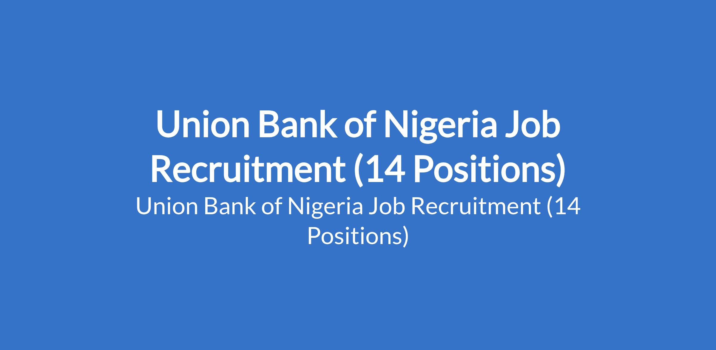 Union Bank of Nigeria is currently recruiting suitably qualified candidates to fill the following positions in Lagos State: Team Member, Database Administration; Head, IT Strategy and Planning; Head, Business Analysis; Head, Enterprise Architecture; Head, Innovation and Emerging Technology; Head, Product Management; Head, Business ReEngineering; Team Lead, PMO; Team Lead, Digital Channels; Scrum Master; Team Member, IT Strategy and Planning; Team Member, Innovation and Emerging Technology; Team Member, Business Analysis; and Team Member, Digital Channels.