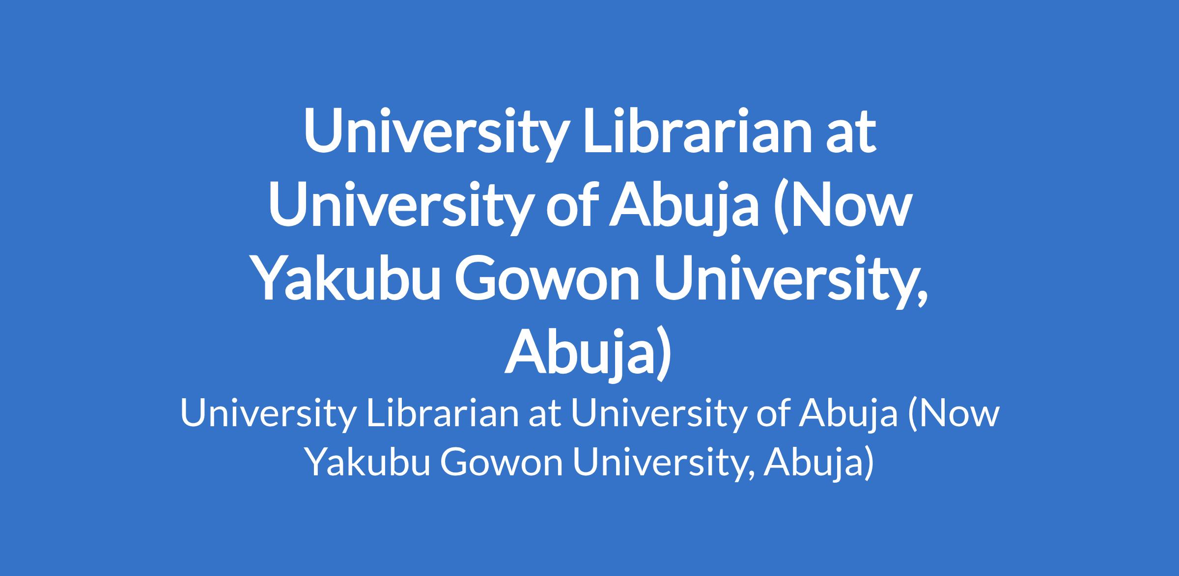 University of Abuja (Now Yakubu Gowon University, Abuja) invites applications for the position of: University Librarian. Interested candidates should possess a good honours Degree plus Master`s and Ph.D Degree in Library and Information Science from a recognized University with at least fifteen (15) years of relevant experience in the University system.