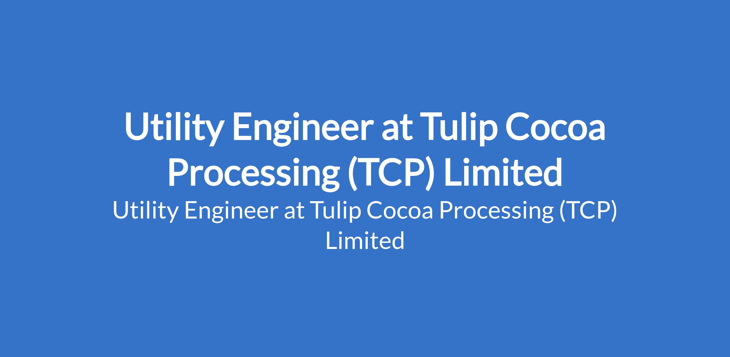 Tulip Cocoa Processing (TCP) Limited is recruiting to fill the position of: Utility Engineer. The position is located in Ijebu-Imushin, Ogun State. Salary: N400,000 Monthly Gross. Interested candidates should possess a B.Sc, B.Eng / HND in Mechanical / Chemical Engineering and other related courses with 5 years+ experience in a food or agro-processing plant (preferably cocoa, chocolate, or FMCG); and not more than 45 years of age.