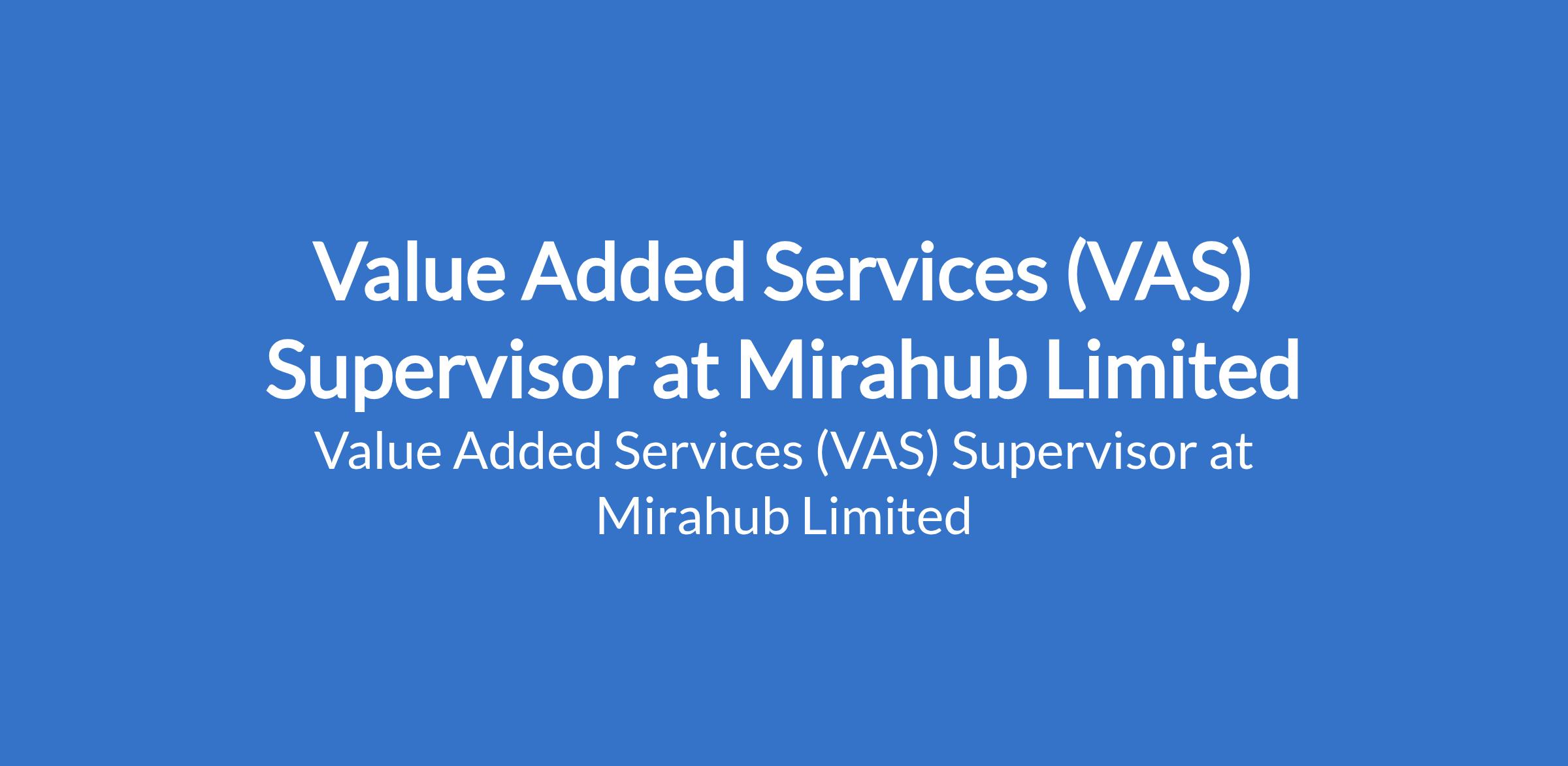 Mirahub Limited is recruiting to fill the position of: Value Added Services (VAS) Supervisor. The position is located in Ikeja, Lagos State. Interested candidates should possess an HND / Bachelors Degree in Business, Management, or related field with 2 3 years experience in VAS, telecom, device support, or customer service operations.