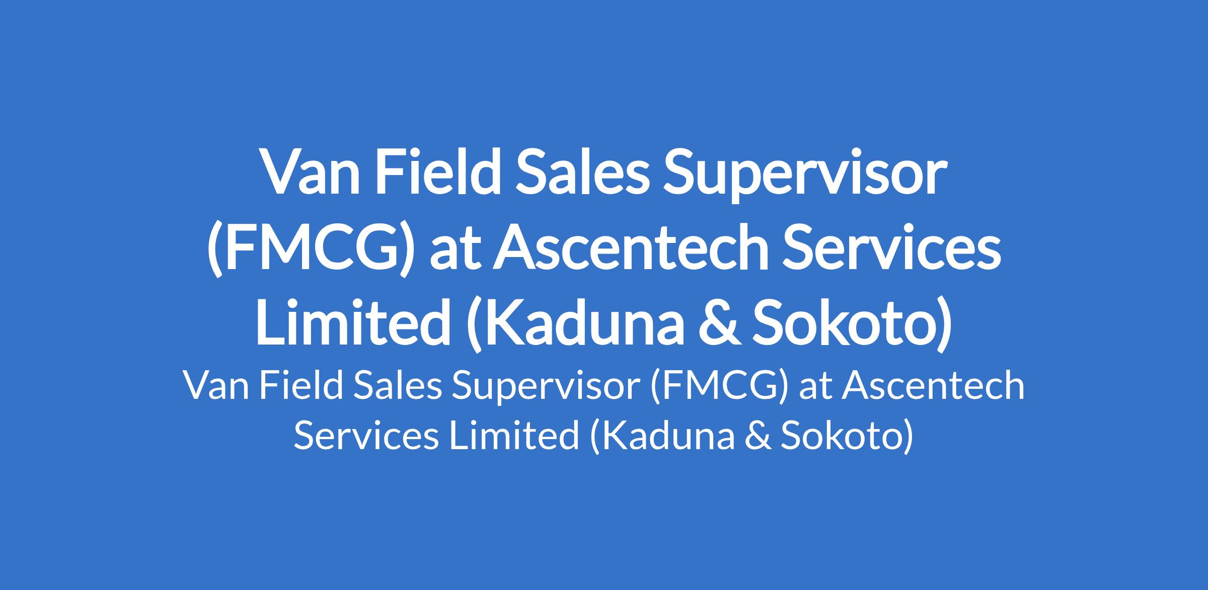 Ascentech Services Limited is recruiting to fill the position of: Van Field Sales Supervisor (FMCG). The position is located in Kaduna and Sokoto States. Interested candidates should possess an HND with 35 years FMCG field sales experience (van sales preferred); Relevant experience as a van field sales supervisor is mandatory.