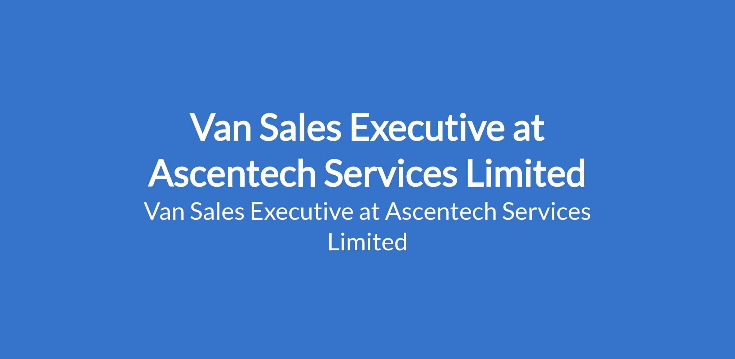 Ascentech Services Limited is recruiting to fill the position of: Van Sales Executive. The position is located in Ikotun-Ejigbo, Lagos State. Salary: N100,000 - N135,000 monthly. Interested candidates should possess an OND / HND / B.Sc Degree with 1-2 years experience.