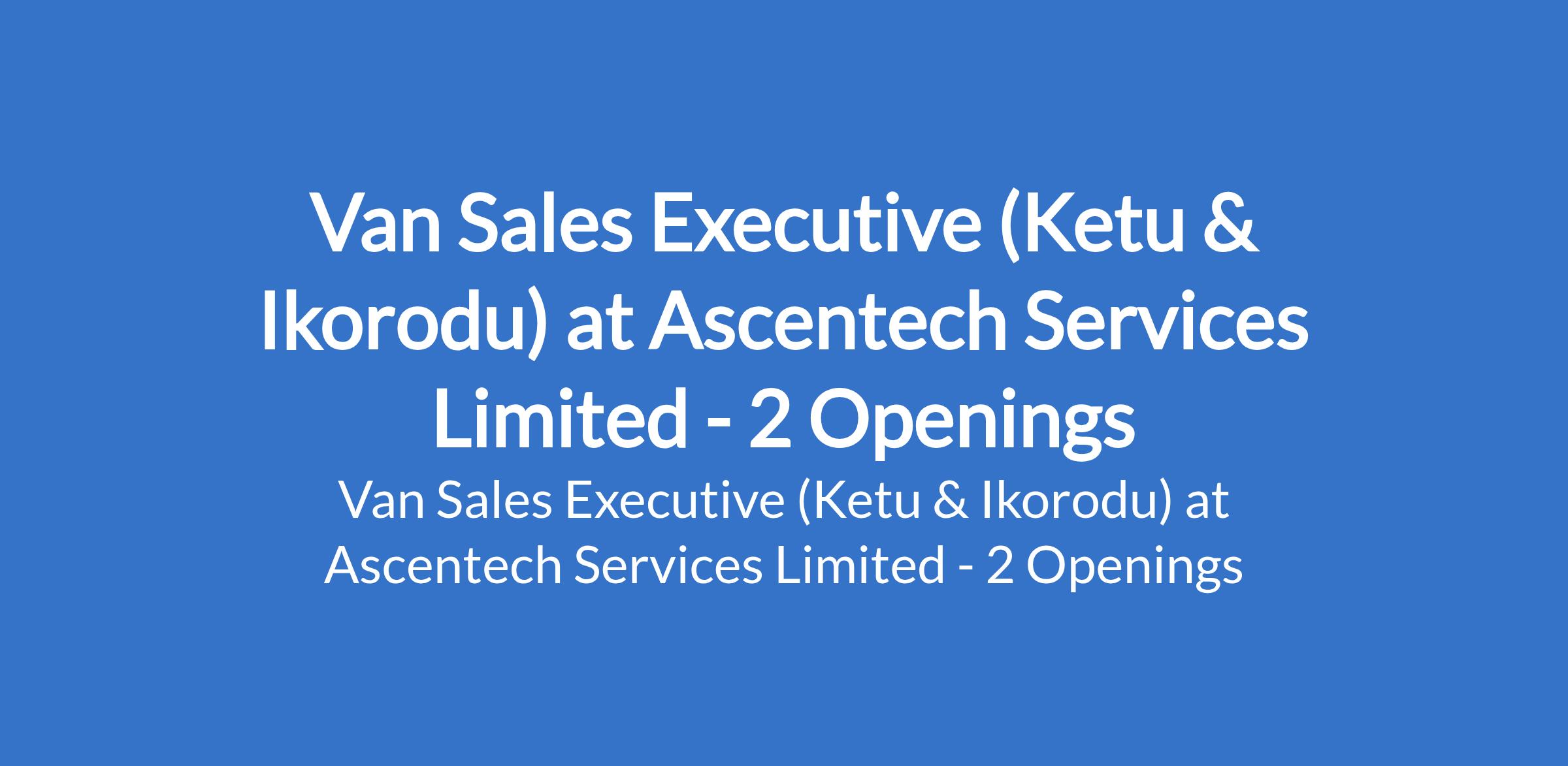 Ascentech Services Limited is recruiting to fill the position of: Van Sales Executive. The position is located in Ketu, & Ikorodu - Lagos State. Salary: N135,000 Monthly. Interested candidates should possess an OND / HND / B.Sc with FMCG sales experience; van/field sales experience is a plus.