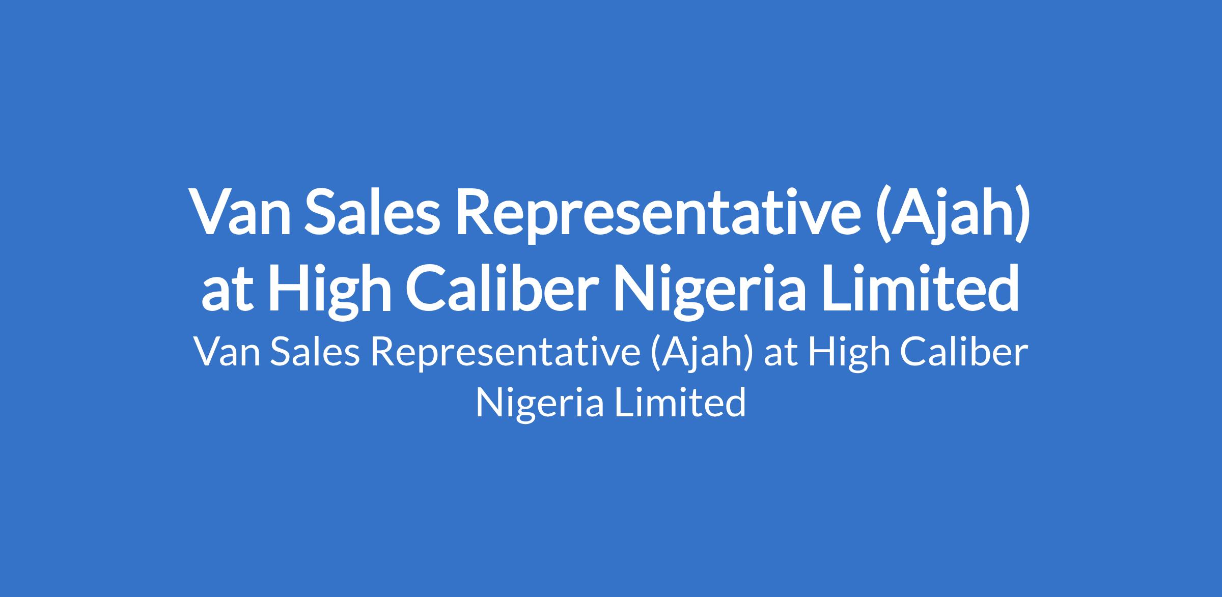 High Caliber Nigeria Limited is recruiting to fill the position of: Van Sales Representative. The position is located in Ajah, Lagos State. Salary: N120,750 / month. Interested candidates should possess a minimum of OND certificate with at least 1 year and above experience.