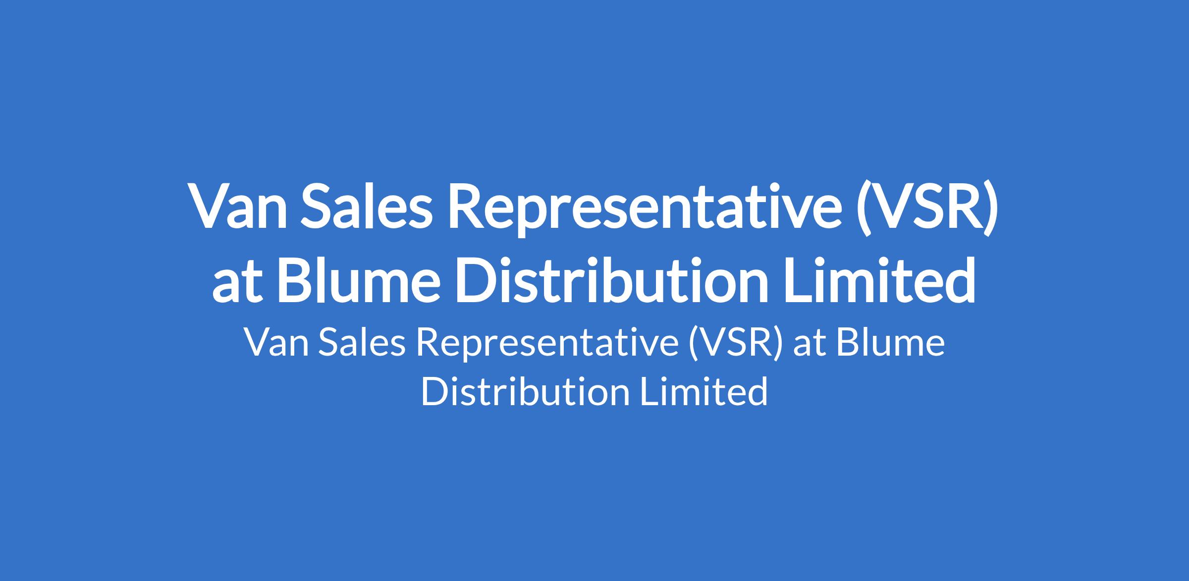 Blume Distribution Limited is recruiting to fill the position of: Van Sales Representative (VSR). Salary: N100,000 - N150,000 per month. Interested candidates should possess a minimum of OND/NCE qualification (HND/BSc is an advantage) with 37 years experience in FMCG sales/distribution.