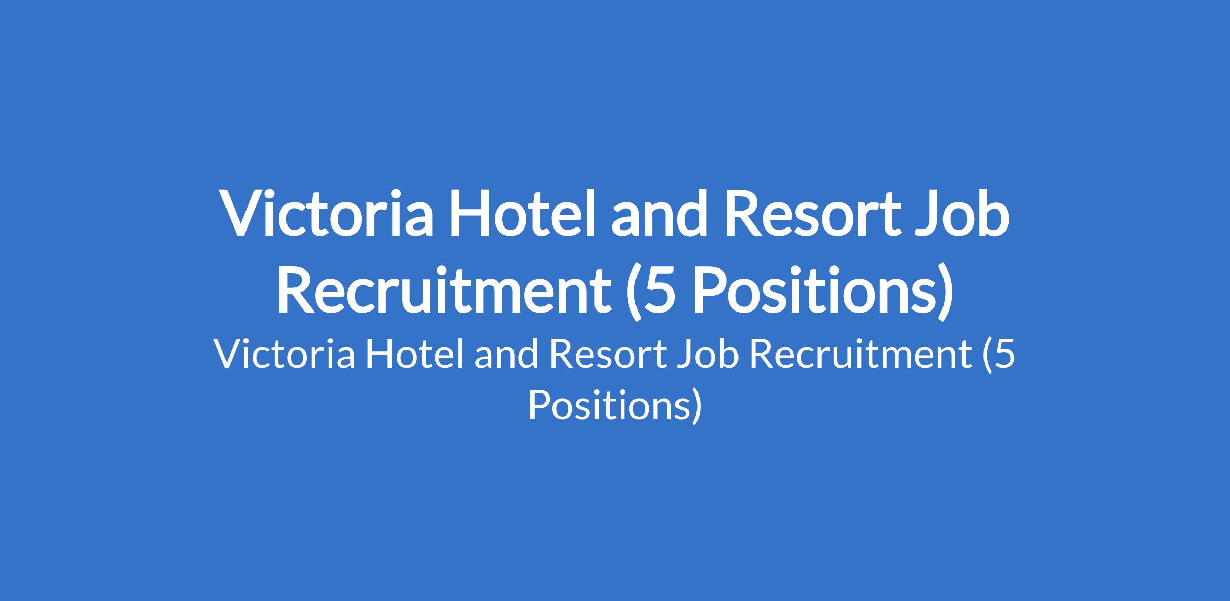 Victoria Hotel and Resort is recruiting suitably qualified candidates to fill the following positions in Lagos State: Business Development Manager, Corporate Retreat Supervisor, RF / POP Engineer, Fiber Field Engineer (FSE), and Legal Compliance / HR Officer.