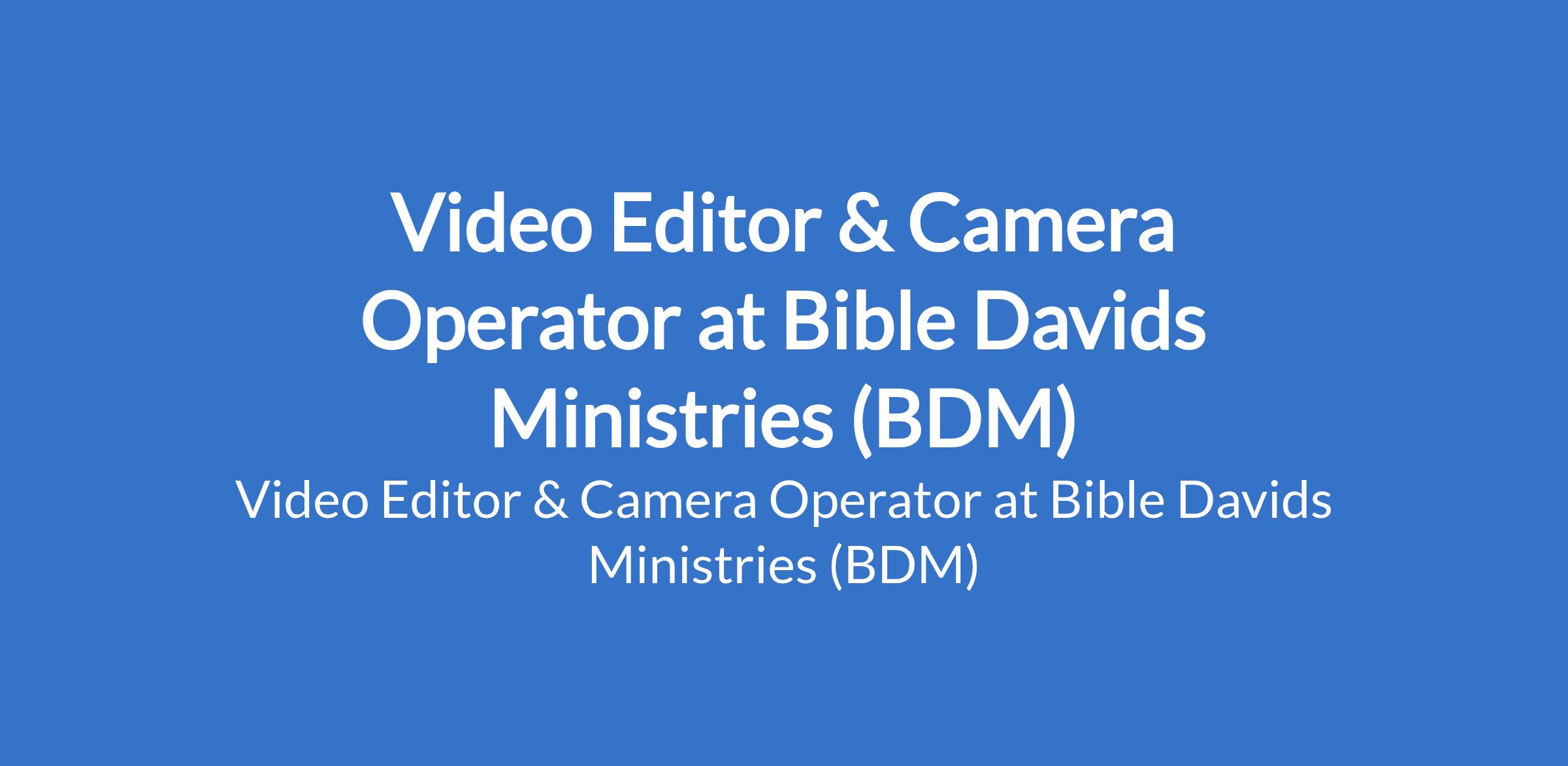 Bible Davids Ministries (BDM) is recruiting to fill the position of: Video Editor & Camera Operator. The position is located in Abuja. Interested candidates should possess a Diploma or Degree in Film, Media, Communications, or related field with a minimum of 3 years professional experience in video editing.