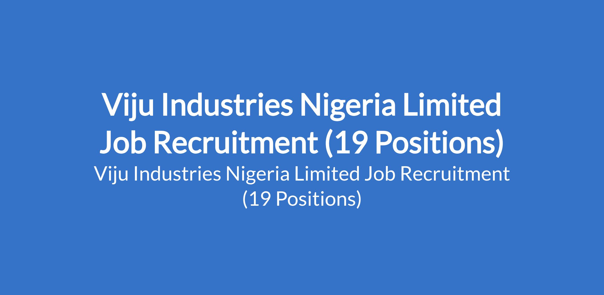 Viju Industries Nigeria Limited is recruiting suitable candidates to fill the following positions in Abuja, Ogun, and Lagos States: Warehouse Supervisor, Welder, Water Line Operator - Abuja, Water Line Operator - Ogun, Pet Water Line Production Manager, Dairy Line Manager, Injection Molding Technician, Maintenance Personnel, Dairy Line Production Manager, Safety Manager, Production Manager, Maintenance Personnel, Generator Technician, Quality Control Manager, Labeling Machine Operation and Maintenance Personnel, Water Production Line Blow-Fill-Seal Equipment Operation and Maintenance Personnel, Air Compressor and Auxiliary Equipment Maintenance Technician, On-site Maintenance and Packaging Line Production Management Personnel, Quality Control Manager, and Air Conditioning Refrigeration Maintenance Officer.