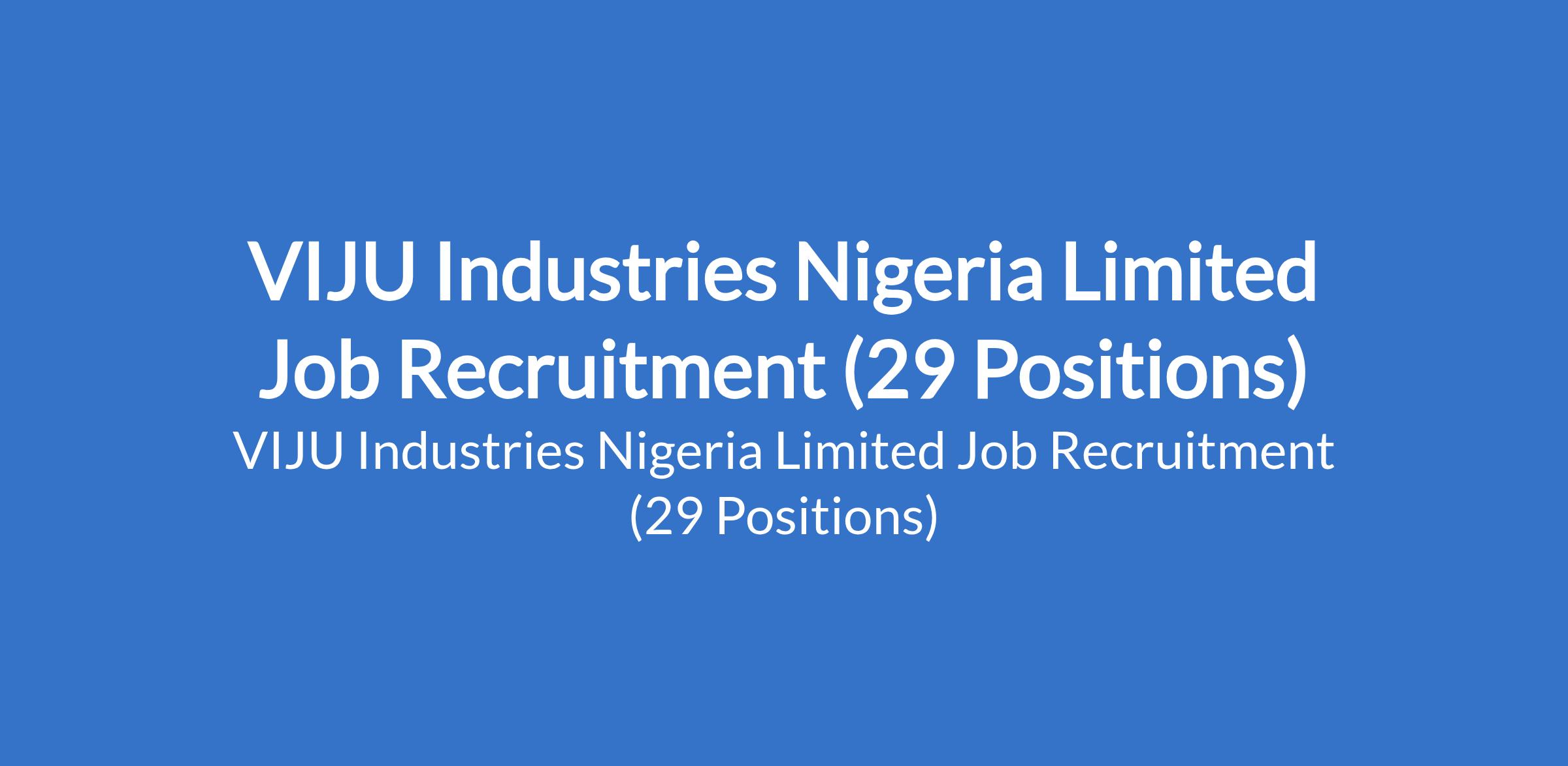 VIJU Industries Nigeria Limited is recruiting suitable candidates to fill the following positions in Abuja, Lagos, Ogun States: Maintenance Personnel, Financial Assistant (Female), Blow-Fill-Seal Machine Operator, Production Manager, Dairy Line Manager, Labeling Machine Operator, Water Line Operator, PET Water Line Production Manager, Packaging Machine Operator, Injection Molding Technician, Welder, Tetra Pack Line Operator, Generator Technician, Safety / Security Manager, Electrician, Quality Control Manager, Labeling Machine Operation and Maintenance Personnel, Air Compressor and Auxiliary Equipment Maintenance Technician, and Safety Manager.